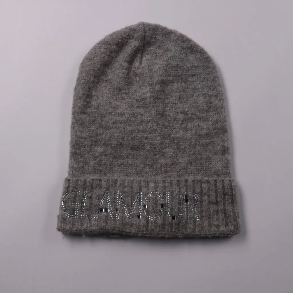 Вязаная шапка серого цвета с отворотом и декором из страз с надписью «GLAMOUR». Подойдёт для повседневной носки в холодную погоду и зимних прогулок. Мягкий трикотаж хорошо тянется и комфортно садится по голове.