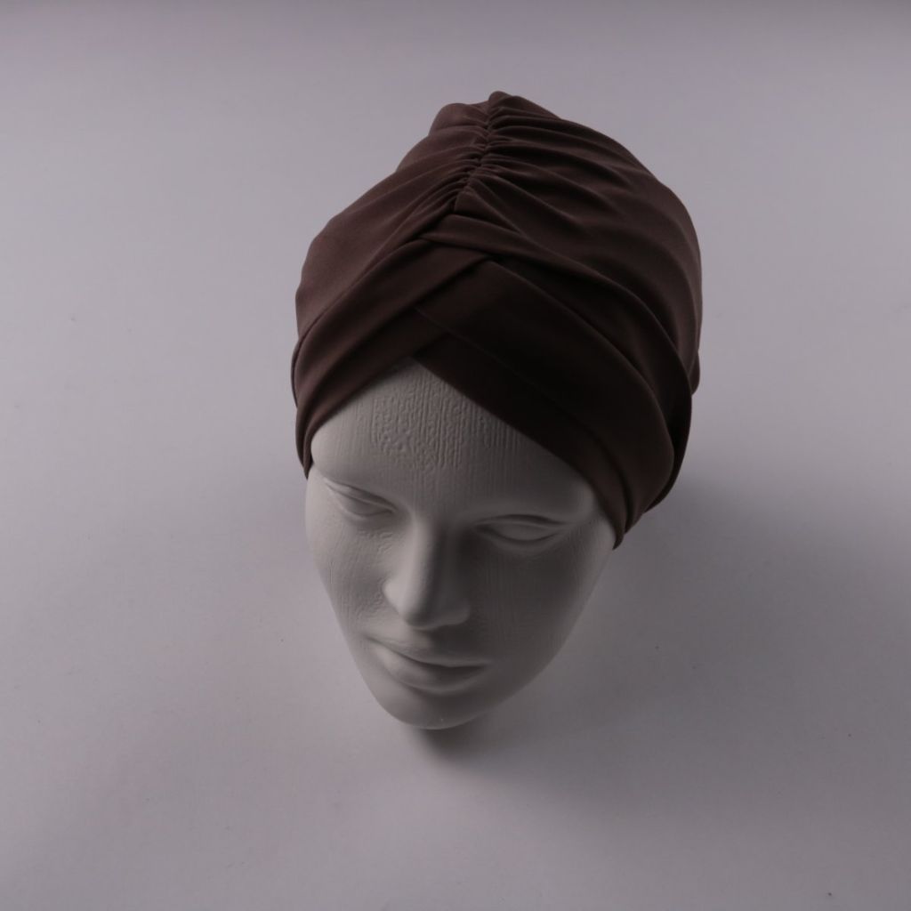 Тюрбан без бренда из гладкой ткани с драпировкой и сборкой сверху. Подойдёт для повседневных образов, фотосессий или как аккуратный вариант головного убора для дома. Легко надевается и хорошо держится на голове за счёт эластичной посадки.