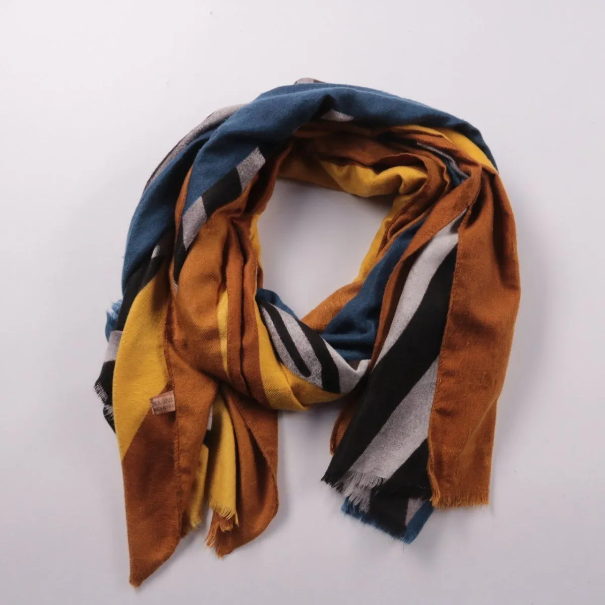 Шарф без указания бренда с геометрическим принтом в сочетании коричневого, синего, жёлтого, серого и чёрного цветов. Подойдёт для демисезонной погоды и легко сочетается с базовой верхней одеждой. Смесь хлопка и вискозы делает его мягким и комфортным в носке.
