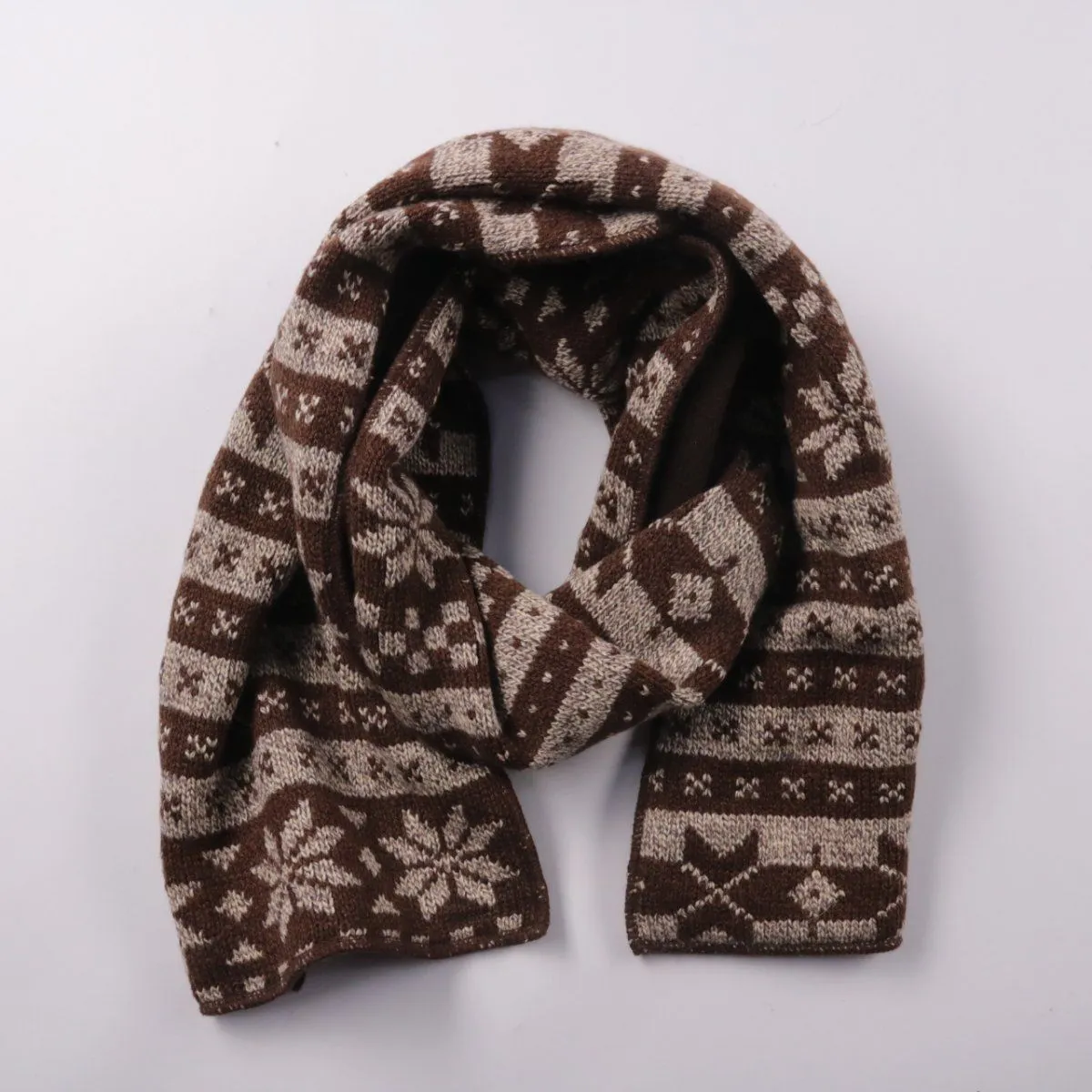 Вязаный шарф с зимним жаккардовым узором в коричнево-бежевой гамме. Подойдёт для холодной погоды и повседневных образов с курткой или пальто. Плотная вязка хорошо держит тепло и комфортно носится поверх верхней одежды.