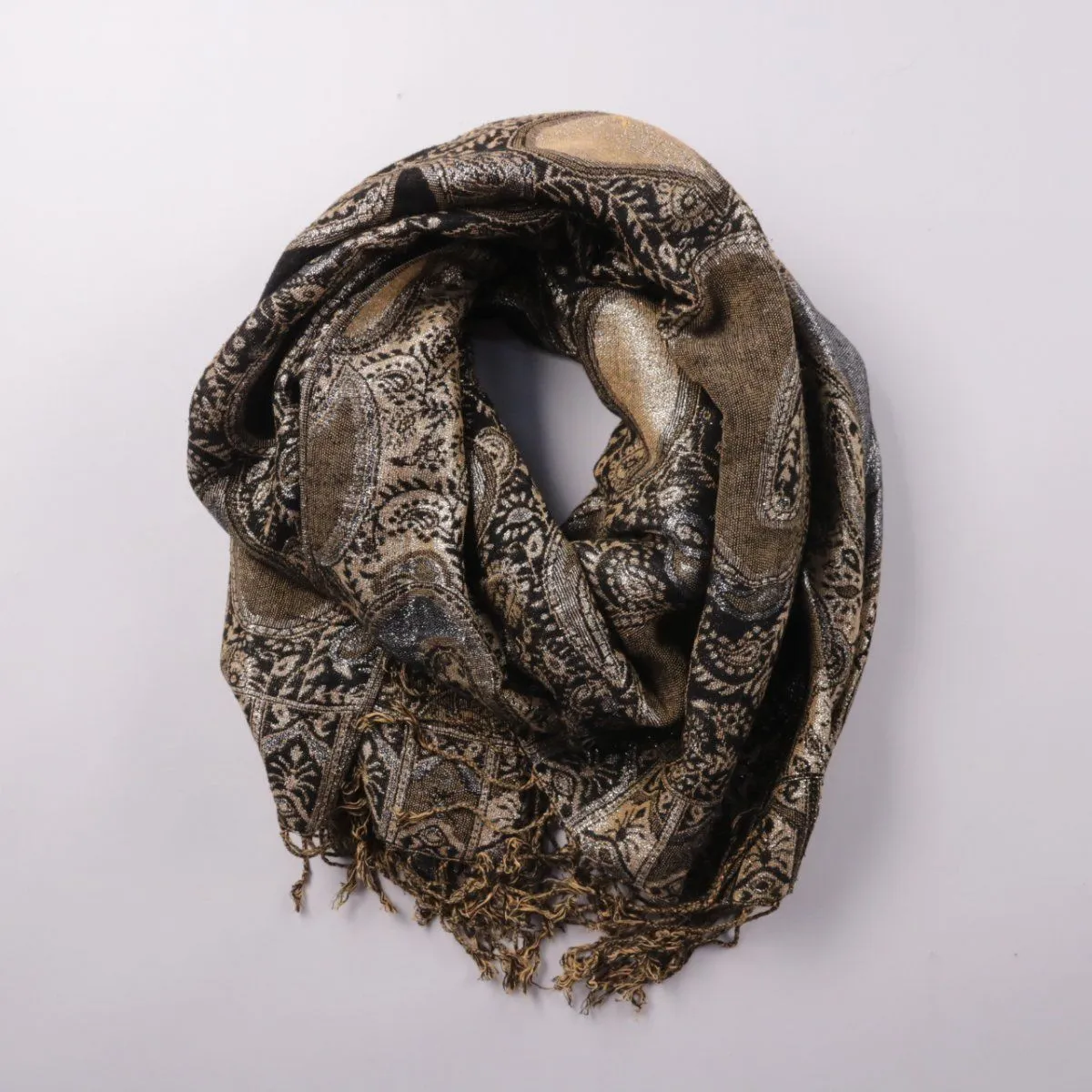 Шарф с жаккардовым узором пейсли и кисточками по краю, без указания бренда. Подойдёт для повседневных образов в прохладную погоду и как акцент к однотонной верхней одежде. За счёт длинного полотна его удобно драпировать и завязывать разными способами.