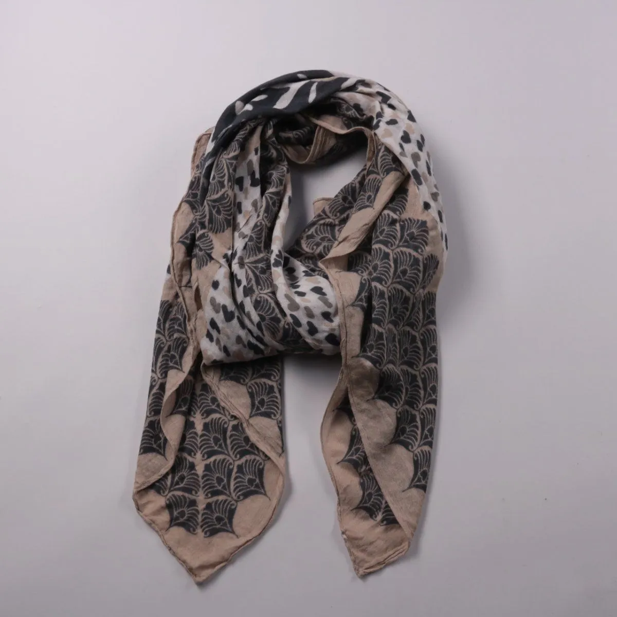 Шарф с комбинированным принтом в бежево-чёрной гамме, без указанного бренда. Подойдёт для повседневных образов и в дорогу, можно носить как шарф или накинуть на плечи. Лёгкая ткань удобно драпируется и занимает мало места в сумке.