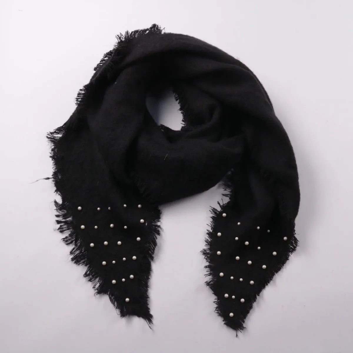 Чёрный шарф с бахромой и декоративными жемчужинами на концах. Подойдёт для повседневных образов и для более нарядных выходов в прохладную погоду. Лёгкий полиэстер быстро сохнет и прост в уходе.