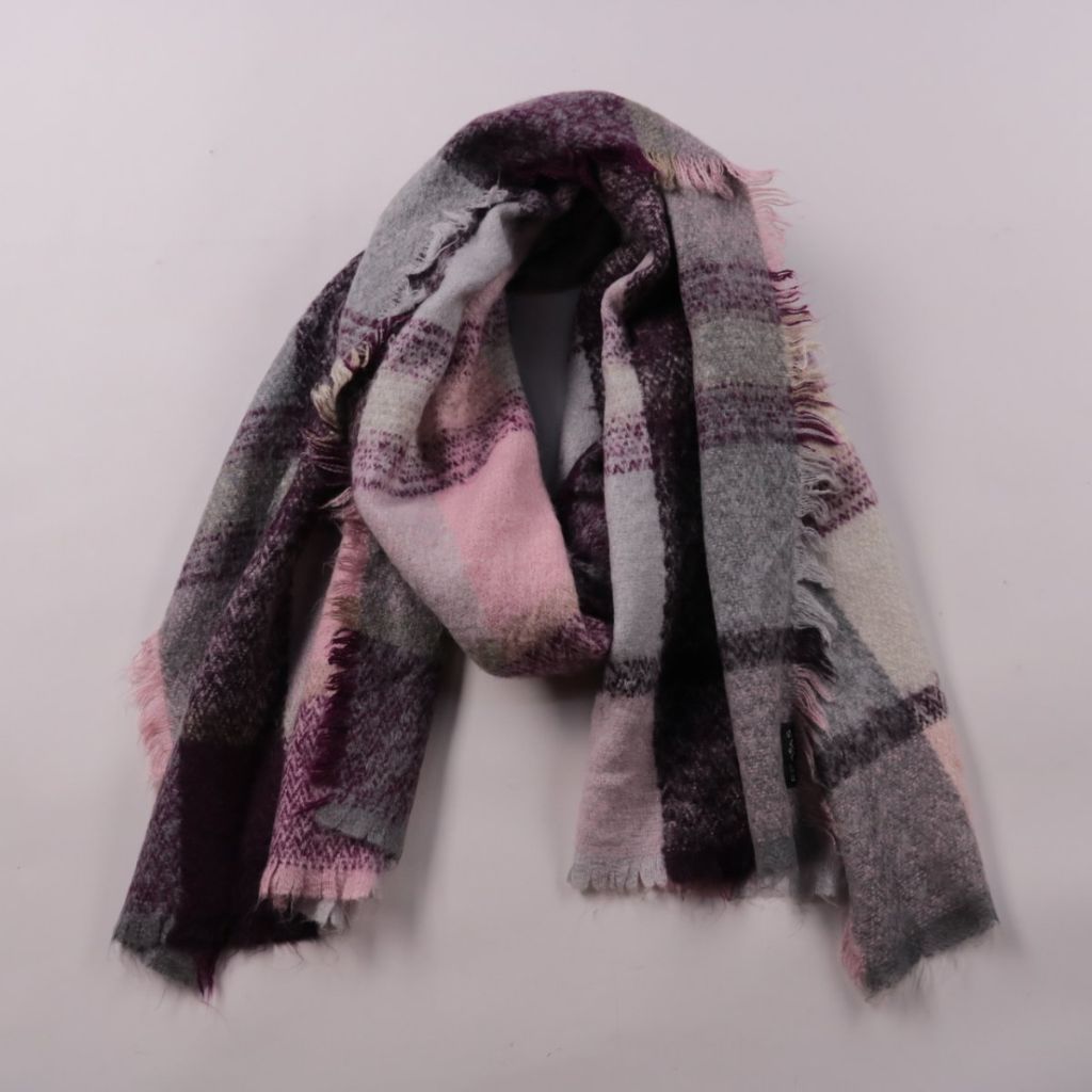 Шарф FRAAS в клетку с бахромой, в серо-розово-фиолетовой гамме. Подойдёт для повседневных образов и поездок в прохладную погоду, можно носить как шарф или накинуть на плечи. Мягкая ткань хорошо драпируется и добавляет тепла без лишнего объёма.