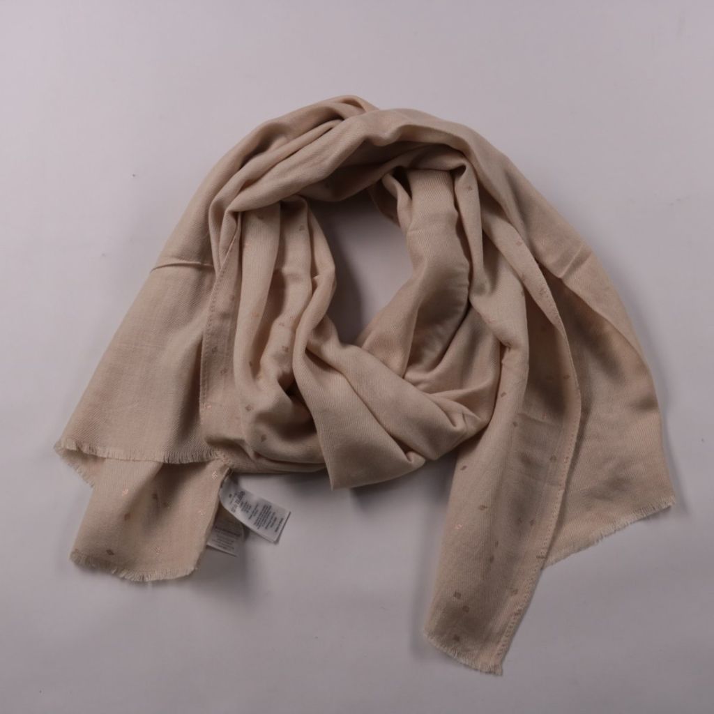 Лёгкий шарф без указанного бренда в бежевом цвете с мелким крапом. Подойдёт для повседневных образов в прохладную погоду и для многослойности. Ткань мягкая и не колется, удобно носить под курткой или пальто.