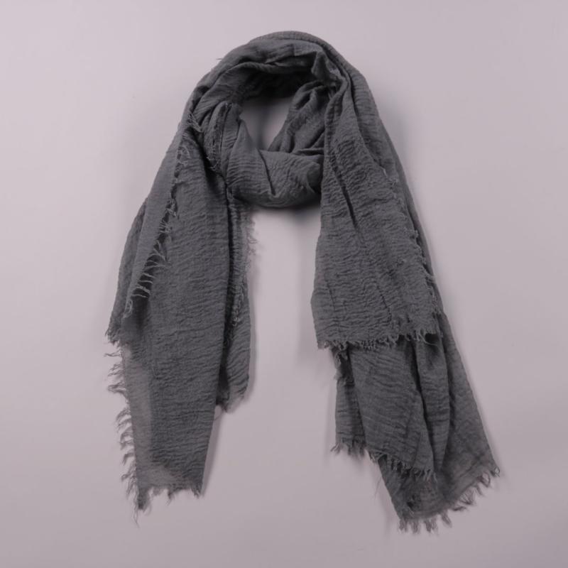 Серый шарф без указания бренда, фактурная ткань с бахромой по краям. Подойдёт для повседневных образов в прохладную погоду и как лёгкий слой в помещении. Легко драпируется и добавляет тепла без лишнего объёма.