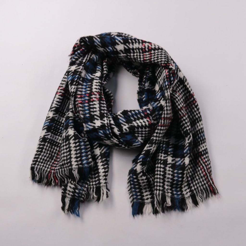 Шарф без указанного бренда в клетку/гусиная лапка с бахромой по краям. Подойдёт для холодной погоды и хорошо сочетается с пальто или курткой в базовых оттенках. Практичное преимущество — плотная ткань помогает держать тепло и защищает шею от ветра.