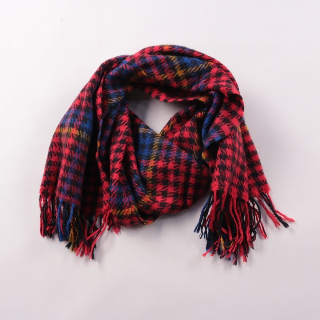 Шарф в клетку с бахромой, без указания бренда. Подойдёт для повседневной носки в холодную погоду и легко сочетается с однотонной верхней одеждой. Практичен тем, что хорошо закрывает шею за счёт плотного полотна.