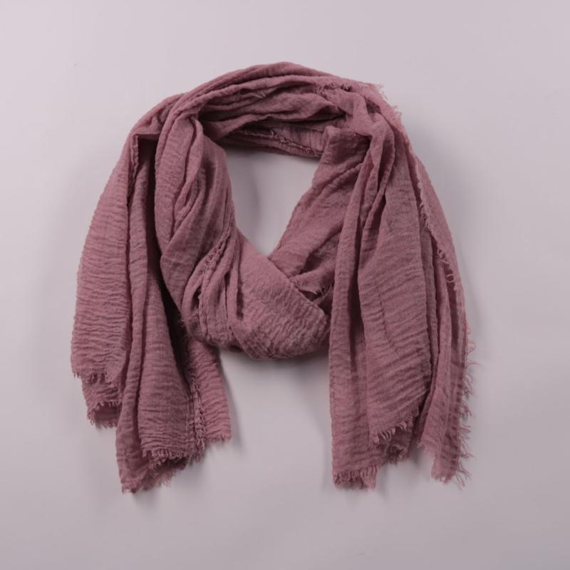 Лёгкий шарф без видимого бренда в пыльно-розовом оттенке, с фактурной жатой поверхностью и короткой бахромой по краям. Подойдёт для демисезона и прохладных летних вечеров, хорошо смотрится с пальто, курткой или тренчем. Практичное преимущество — легко ...