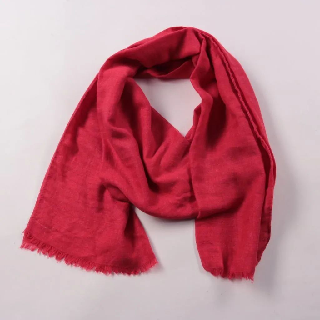 Однотонный красный шарф с лёгкой фактурой ткани и небольшими бахромчатыми краями. Подойдёт для повседневных образов и как акцент к пальто или куртке в прохладную погоду. Легко складывается и не занимает много места в сумке.
