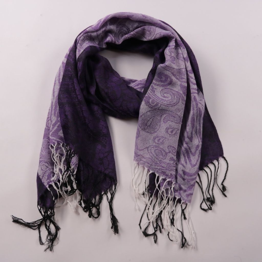Фиолетовый шарф с жаккардовым узором и контрастной бахромой по краям. Подойдёт для повседневных образов и как лёгкий слой в прохладную погоду. Удобно драпируется и добавляет акцент к однотонной верхней одежде.