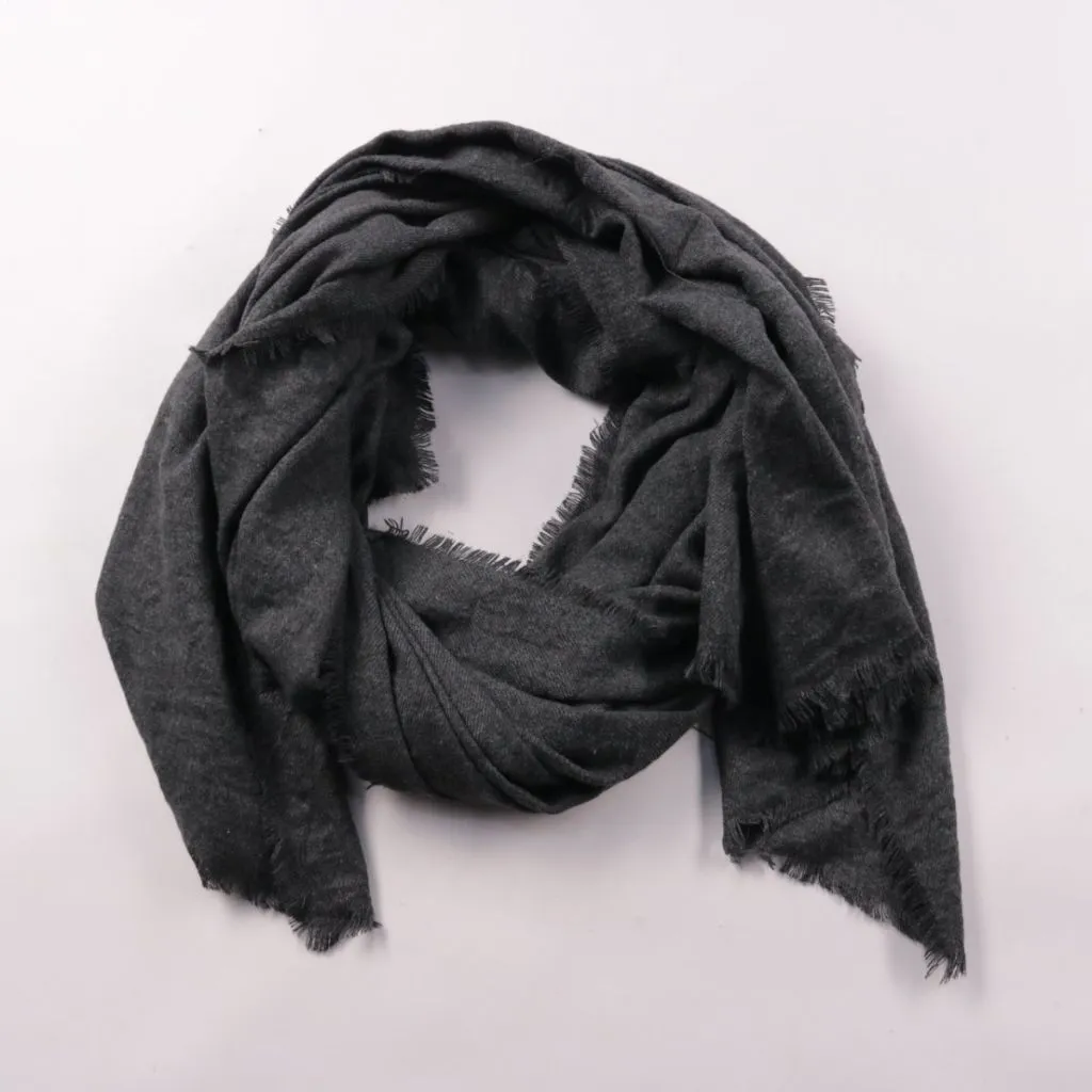 Тёмно-серый шарф без бренда с мягкой фактурой и короткой бахромой по краям. Подойдёт для прогулок и офиса в прохладную погоду, легко сочетается с пальто и куртками. Можно носить разными способами и компактно складывать в сумку.