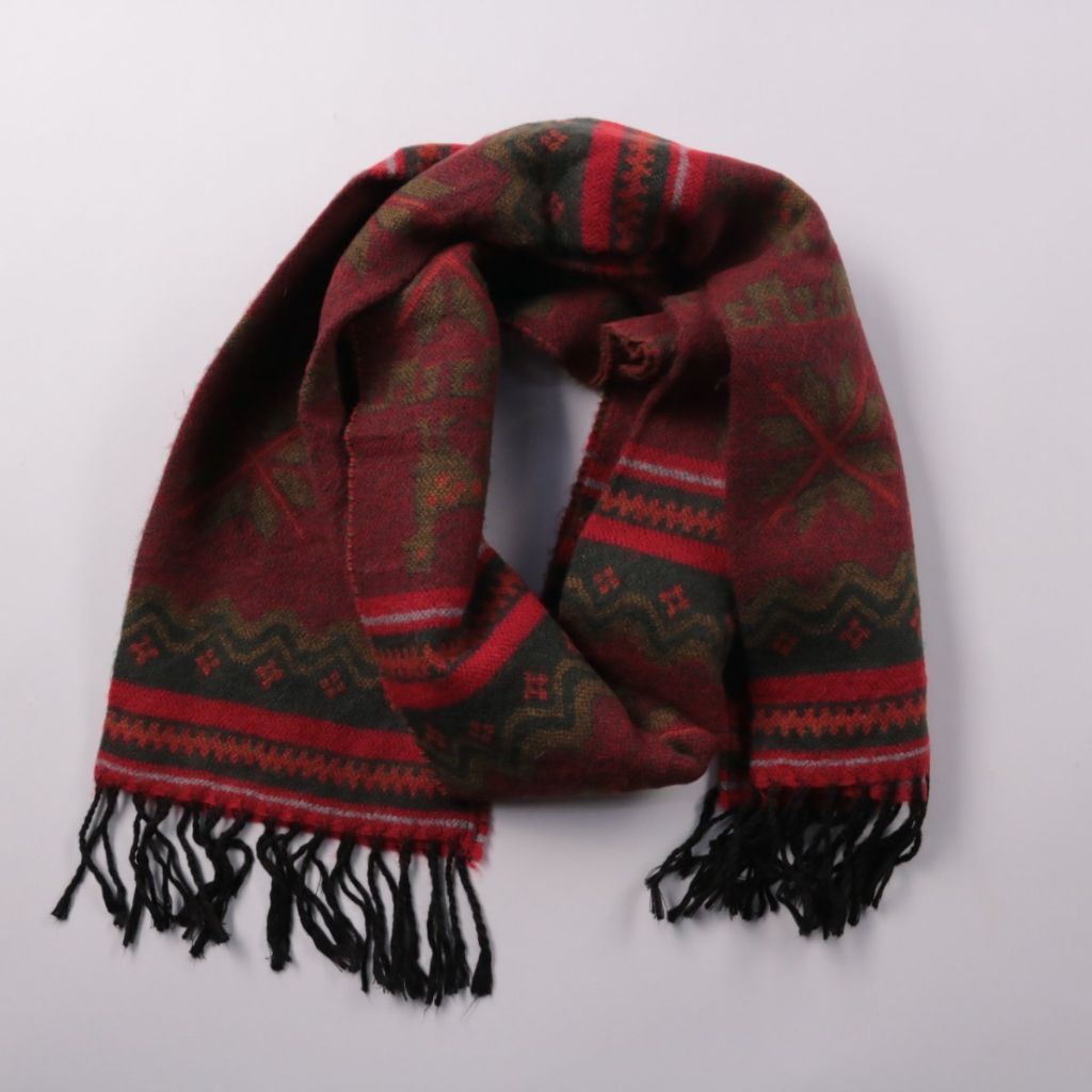 Шарф с кисточками, бордового цвета с жаккардовым орнаментом. Подойдёт для холодной погоды и повседневных образов, удобно носить с пальто или курткой. Хорошо защищает шею от ветра и быстро добавляет акцент к одежде.