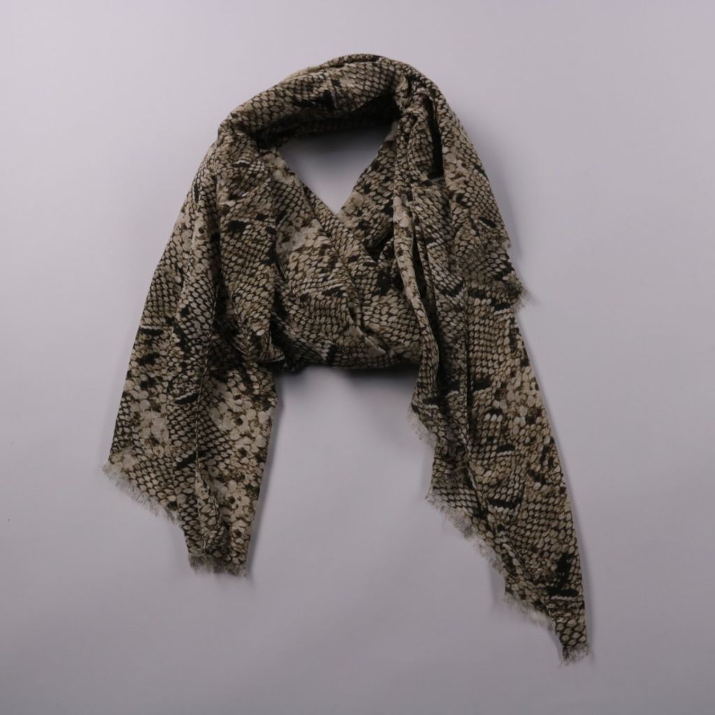 Шарф John Lewis & Partners со змеиным принтом и мягкой бахромой по краю. Подойдёт для повседневных образов и как акцент к однотонной верхней одежде в межсезонье. Лёгкий полиэстер практически не мнётся и быстро сохнет после стирки.