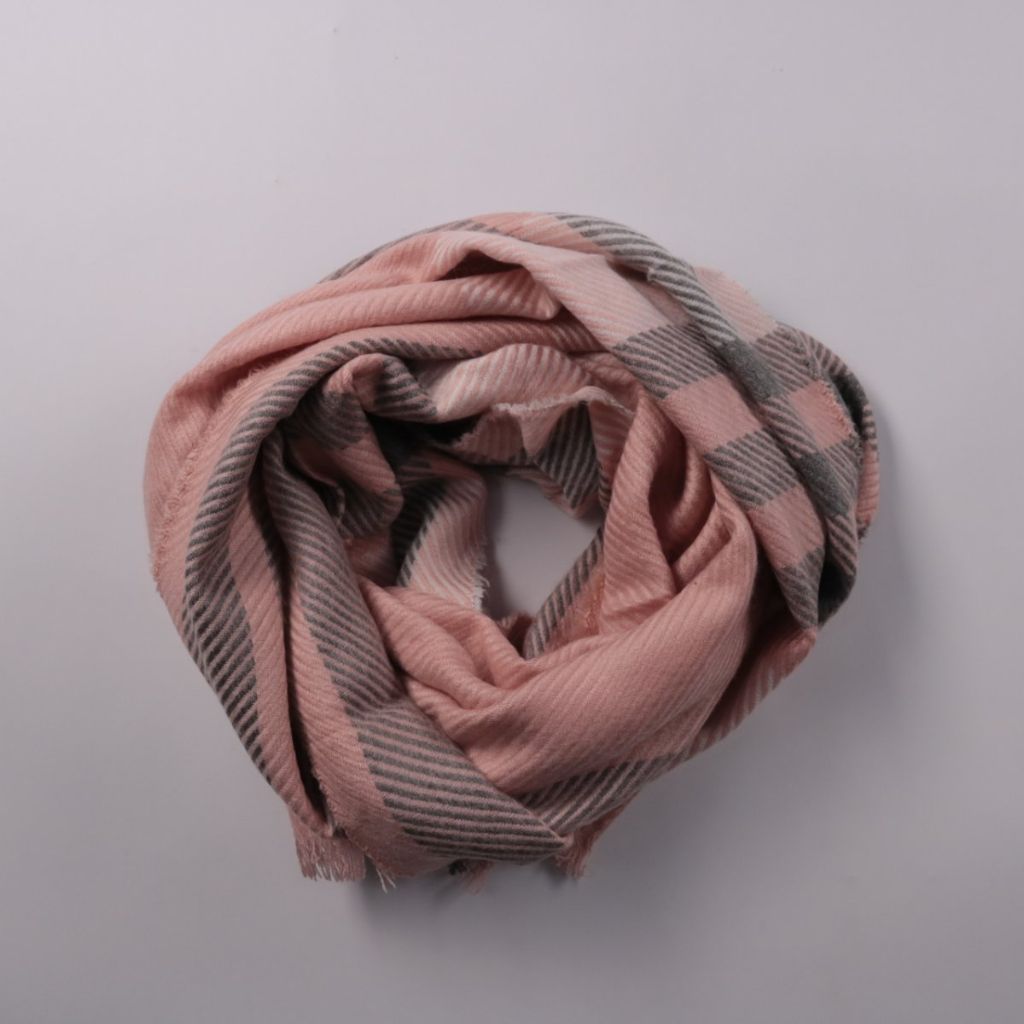 Шарф Primark в розово-серую клетку с мягкой фактурой и бахромой по краю. Подойдёт для повседневных образов в холодную погоду и в качестве акцента к однотонной верхней одежде. Удобно драпируется и хорошо закрывает шею от ветра.