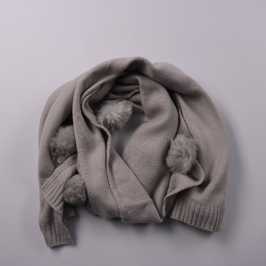 Вязаный шарф с меховыми помпонами в сером цвете. Подойдёт для зимних прогулок и повседневных образов, хорошо сочетается с пальто и пуховиком. Практичное преимущество — акрил легко стирается и быстро сохнет.