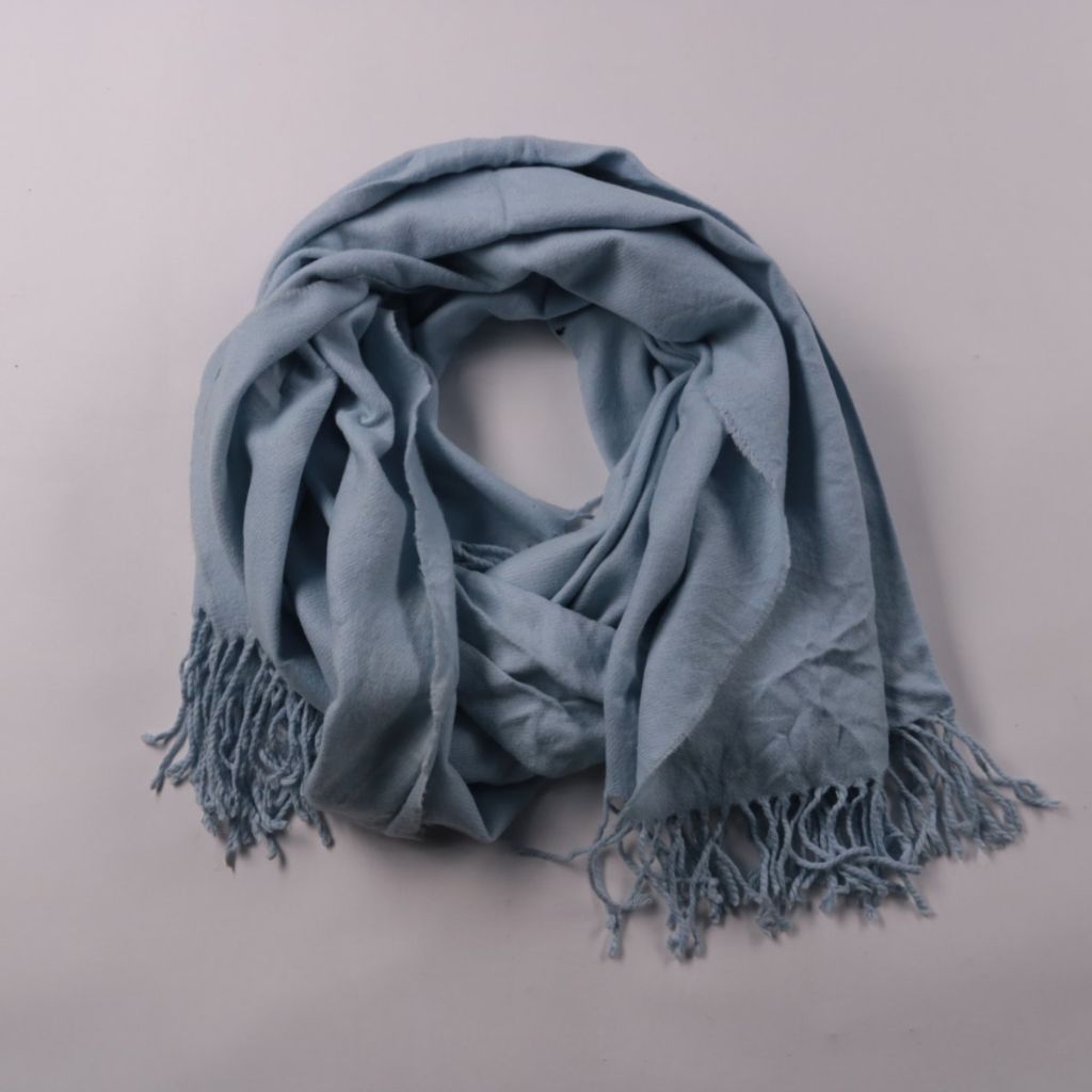 Шарф без бренда в голубом цвете, мягкий и широкий, с бахромой по краю. Подойдёт для повседневных образов и как лёгкое утепление в прохладную погоду. Удобно драпируется и добавляет объём, при этом не занимает много места в сумке.