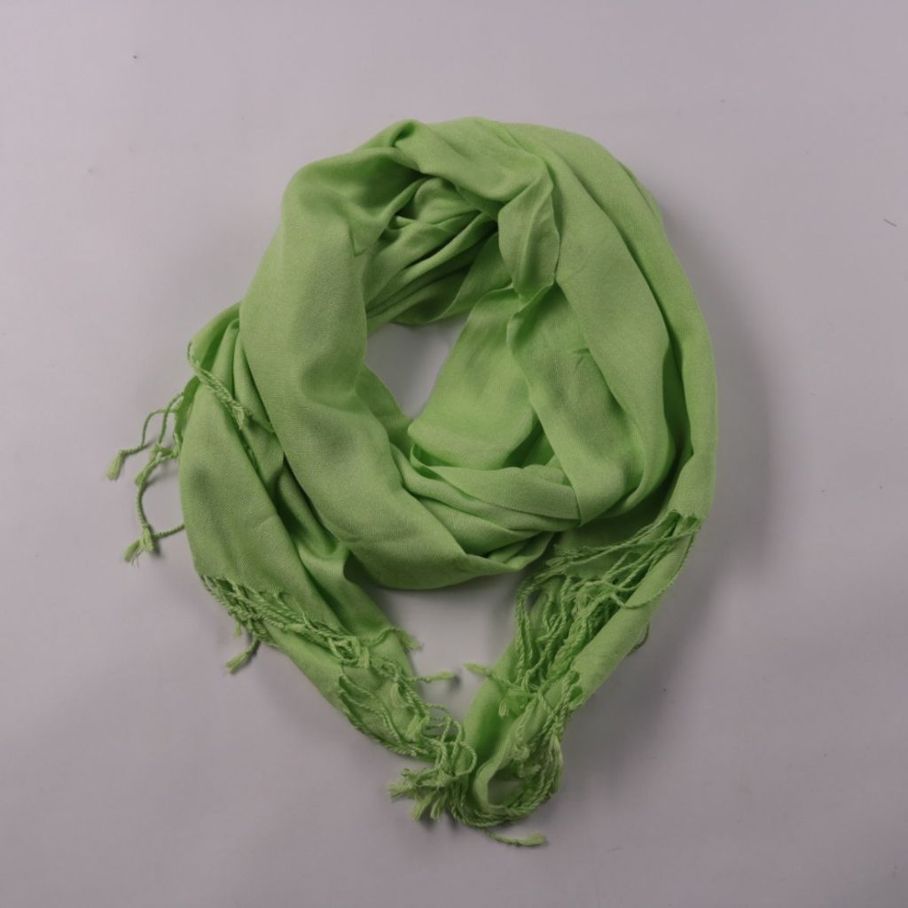 Лёгкий однотонный шарф зелёного цвета с бахромой по краям. Подойдёт для повседневных образов и в качестве акцента к верхней одежде в прохладную погоду. Тонкая ткань легко драпируется и удобно носится в сумке.