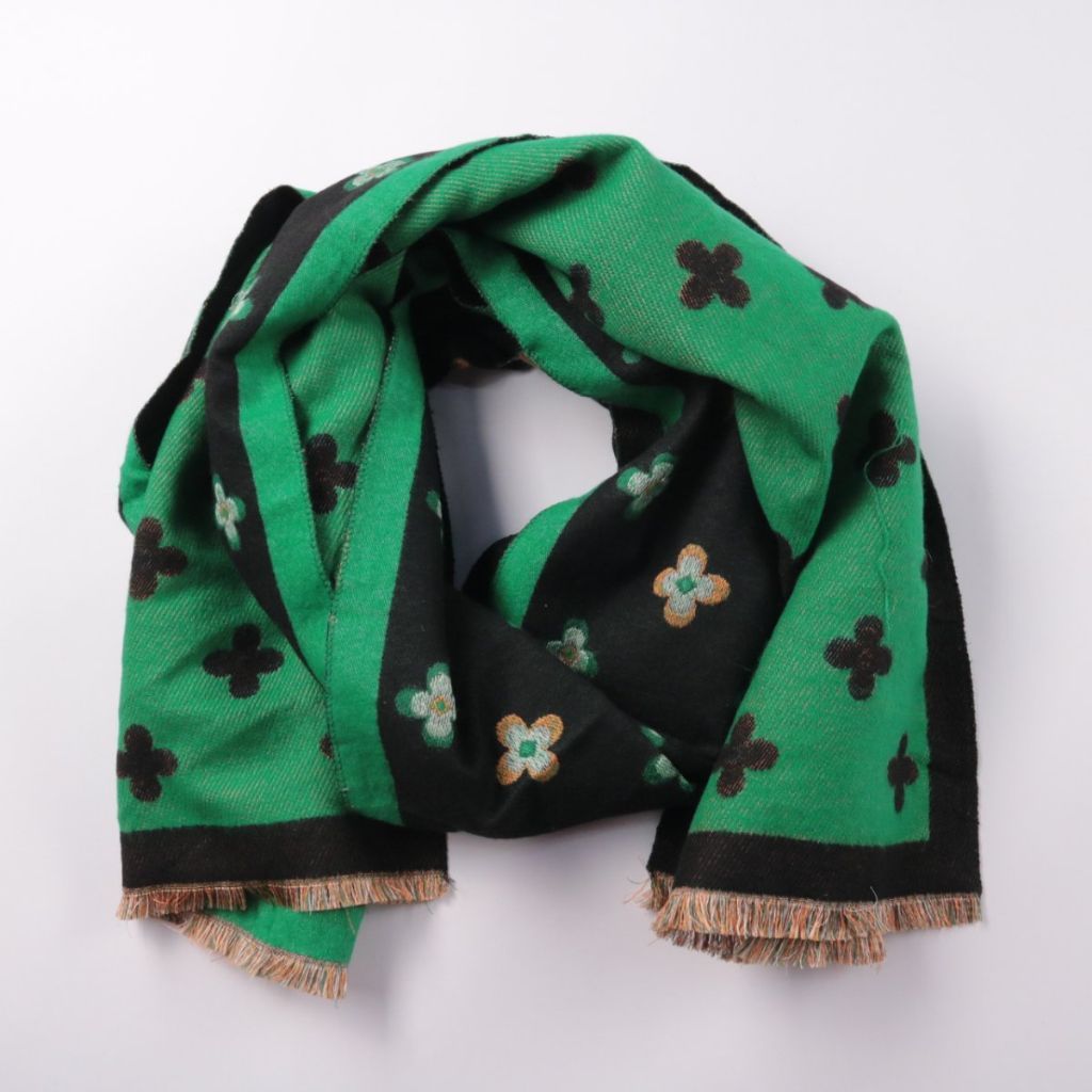 Шарф без указанного бренда в зелёно-чёрной гамме с геометрическим узором и бахромой по краю. Подойдёт для повседневных образов и в прохладную погоду в межсезонье или зимой как дополнительный слой. Легко комбинируется с базовой верхней одеждой и удобно ...