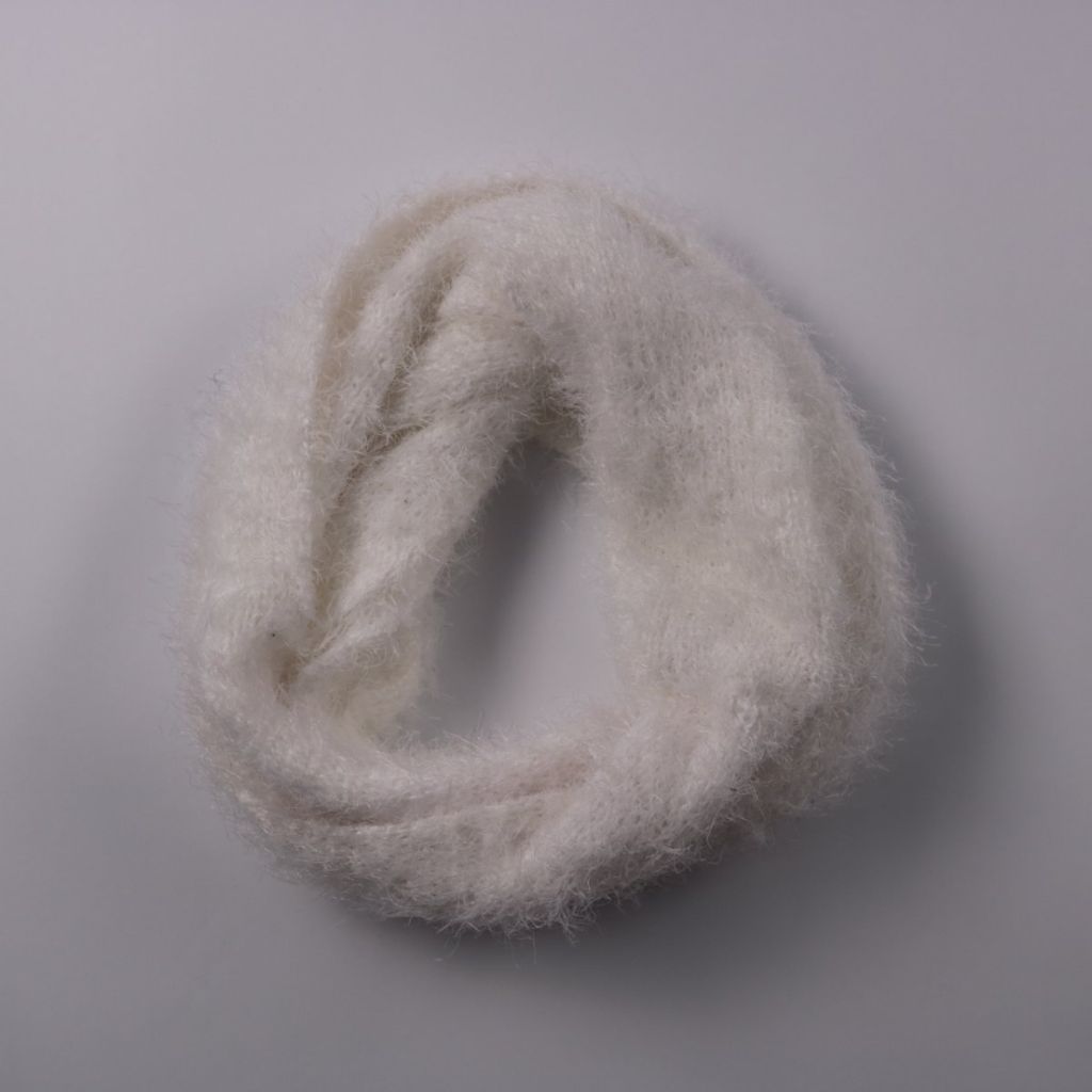 Вязаный шарф-снуд из мягкой пушистой пряжи светлого оттенка. Подойдёт для повседневной носки в холодную погоду и легко сочетается с верхней одеждой. За счёт замкнутой формы удобно сидит на шее и не развязывается.