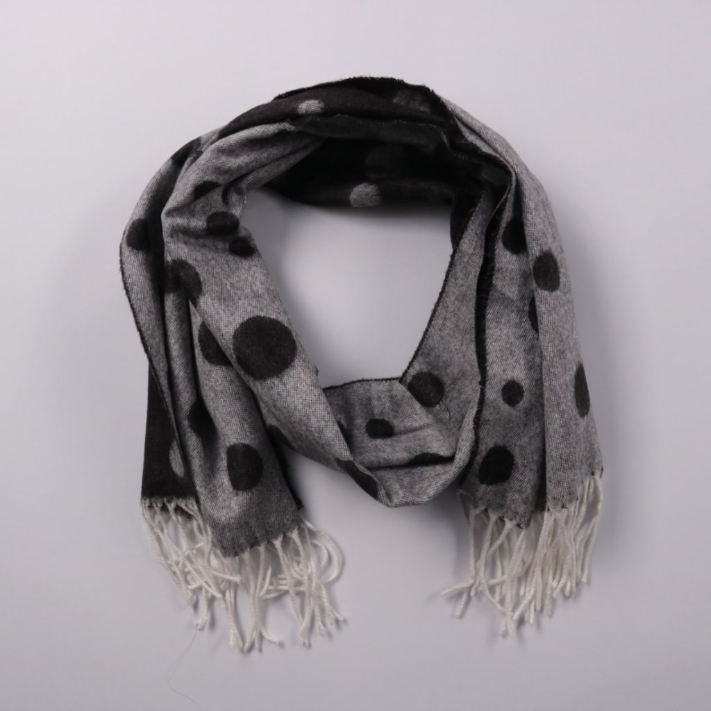 Шарф с принтом в крупный горох и бахромой по краям. Подойдёт для повседневных образов в прохладную погоду, можно носить с пальто или курткой. Легко драпируется и добавляет контрастный акцент за счёт чёрно-серой гаммы.