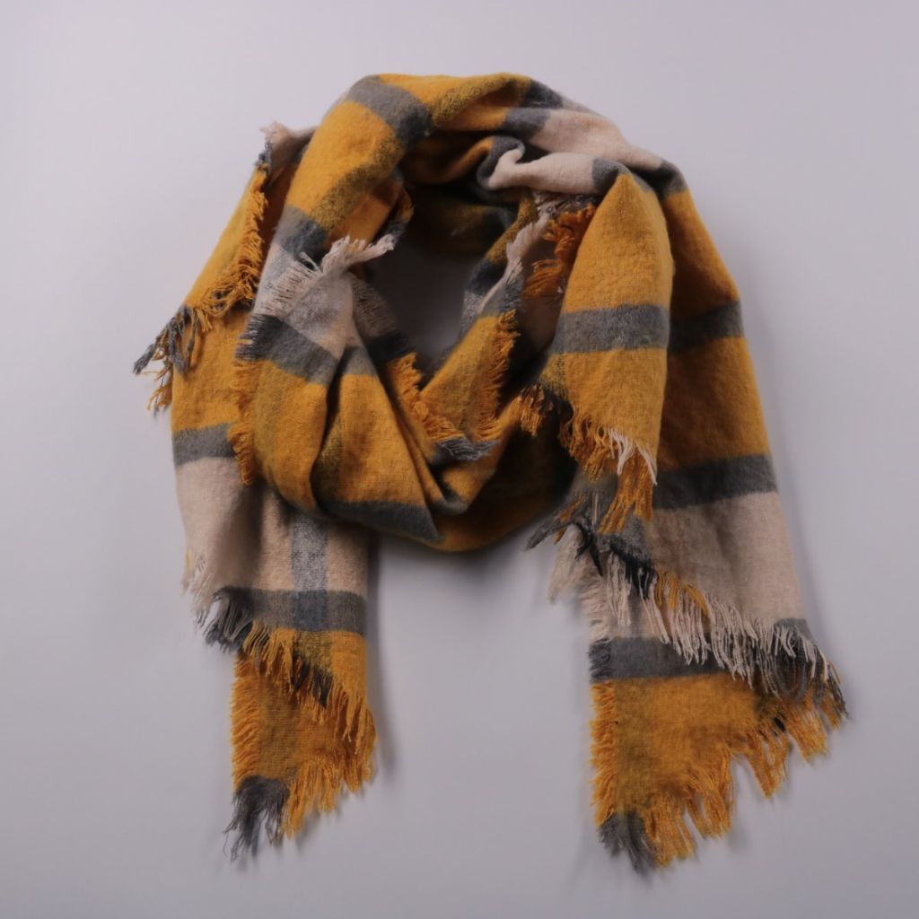 Шарф в клетку с бахромой, в оттенках горчичного, бежевого и серого. Подойдёт для повседневных образов в холодную погоду и на межсезонье. Мягкая ткань хорошо драпируется и удобно укладывается вокруг шеи.