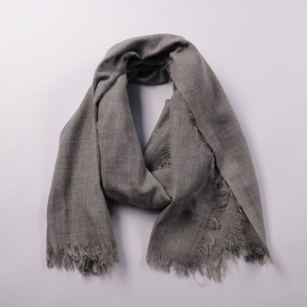Серый шарф с бахромой по краям, без заметного логотипа или принта. Подойдёт для повседневных и более строгих образов в прохладную погоду. Нейтральный цвет легко сочетать с верхней одеждой и аксессуарами.