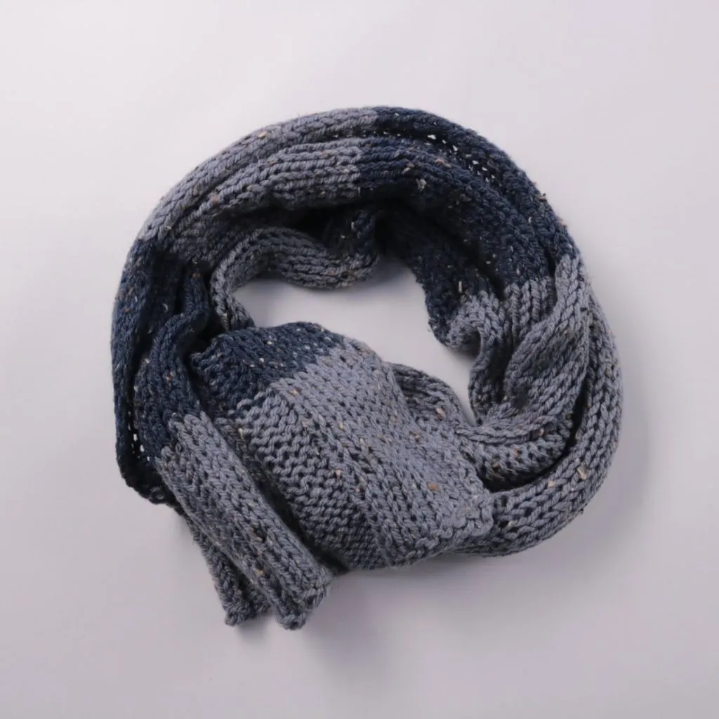 Вязаный шарф-снуд без бренда в сине-серой гамме с фактурной вязкой. Подойдёт для повседневной носки в холодную погоду и хорошо сочетается с куртками и пальто. Удобно носится кольцом и не развязывается на ветру.