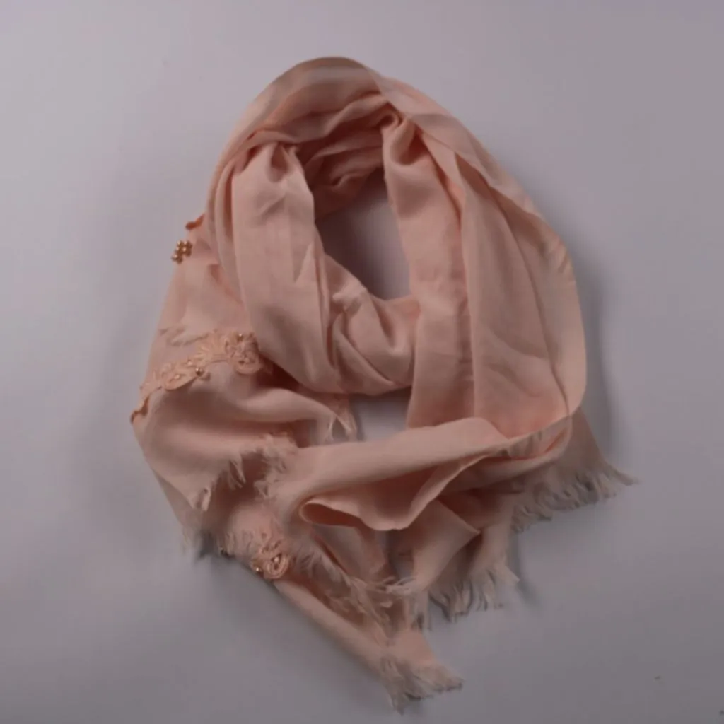 Женский шарф нежно-розового цвета с декоративной вышивкой и бахромой по краю. Подойдёт для повседневных образов и в качестве лёгкого акцента на демисезон. Мягко драпируется и добавляет образу аккуратную деталь без лишнего объёма.