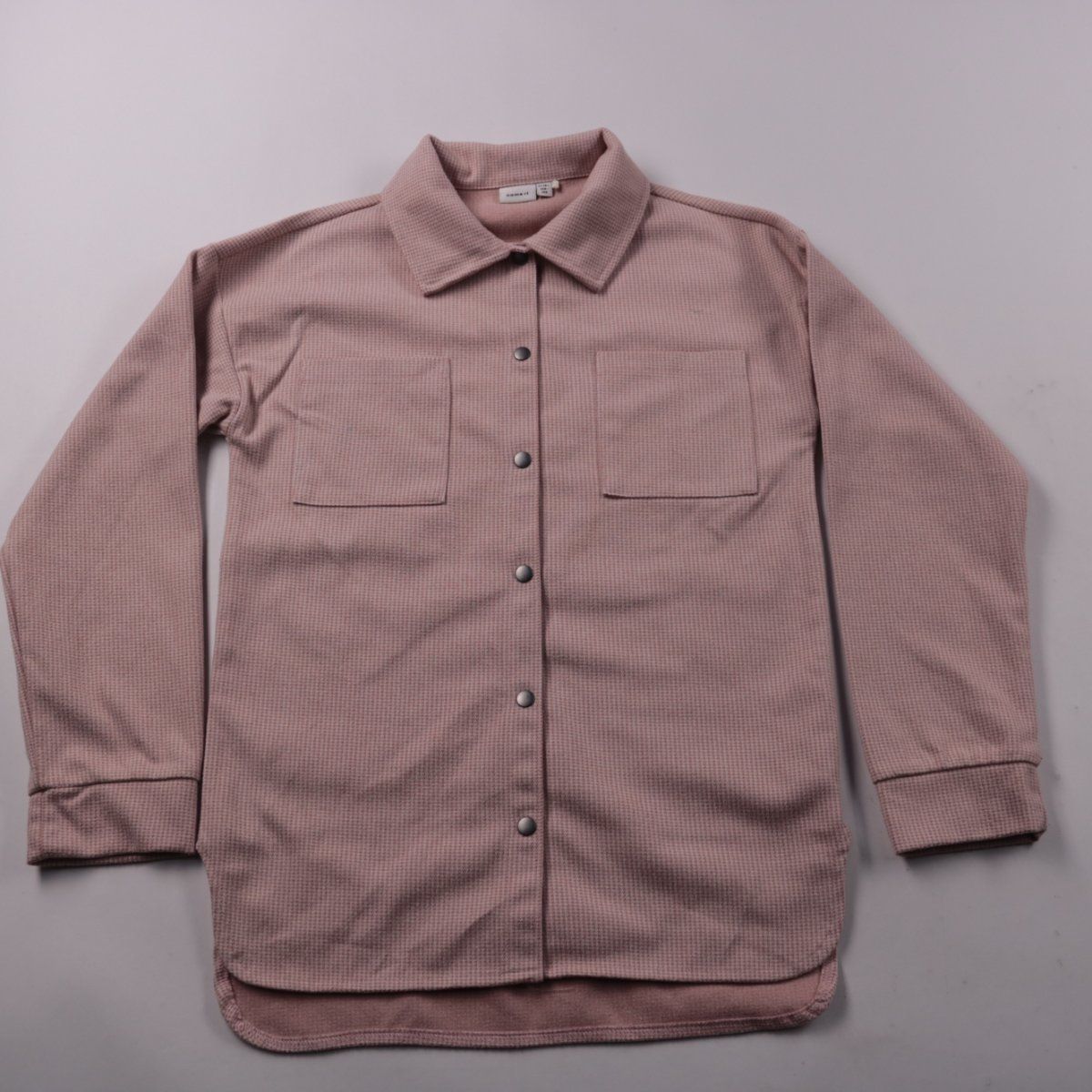 Рубашка-оверсайз Name It пыльно-розового цвета, с отложным воротником, кнопками и двумя накладными карманами на груди. Подойдёт для школы и прогулок в прохладную погоду как верхний слой поверх футболки. Плотная ткань хорошо держит форму и не требует сложного ухода.