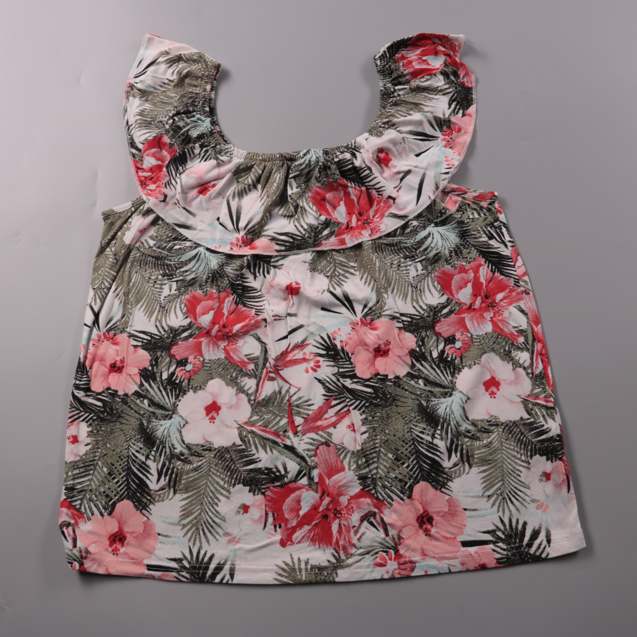 Топ JAZZYN для девочки с тропическим цветочным принтом и широким воланом по горловине. Подойдёт для лета, поездок и прогулок, хорошо сочетается с шортами и юбками. Лёгкая ткань быстро сохнет и удобна в носке.