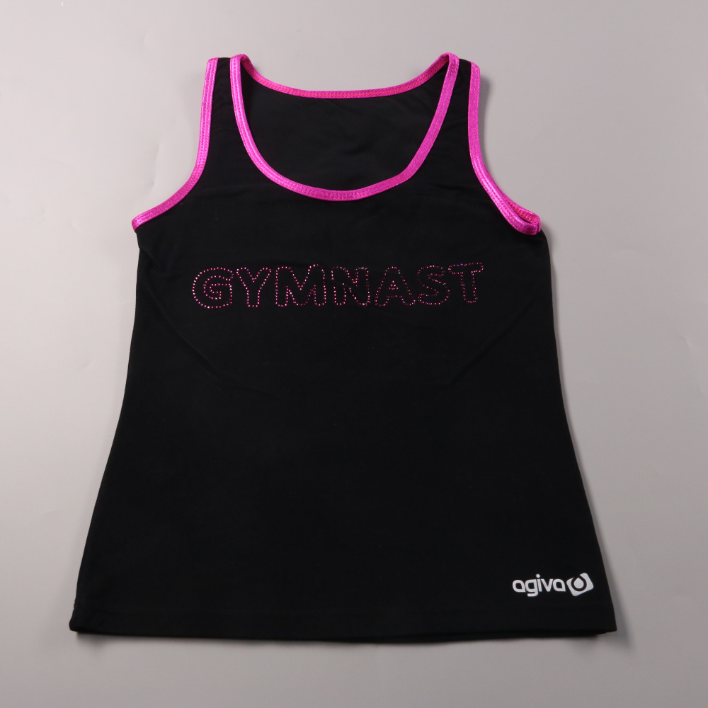 Спортивный топ Agiva чёрного цвета с розовой окантовкой и надписью GYMNAST из страз. Подойдёт для тренировок по гимнастике и активных занятий в зале или на улице. Эластичная ткань хорошо тянется и быстро сохнет.