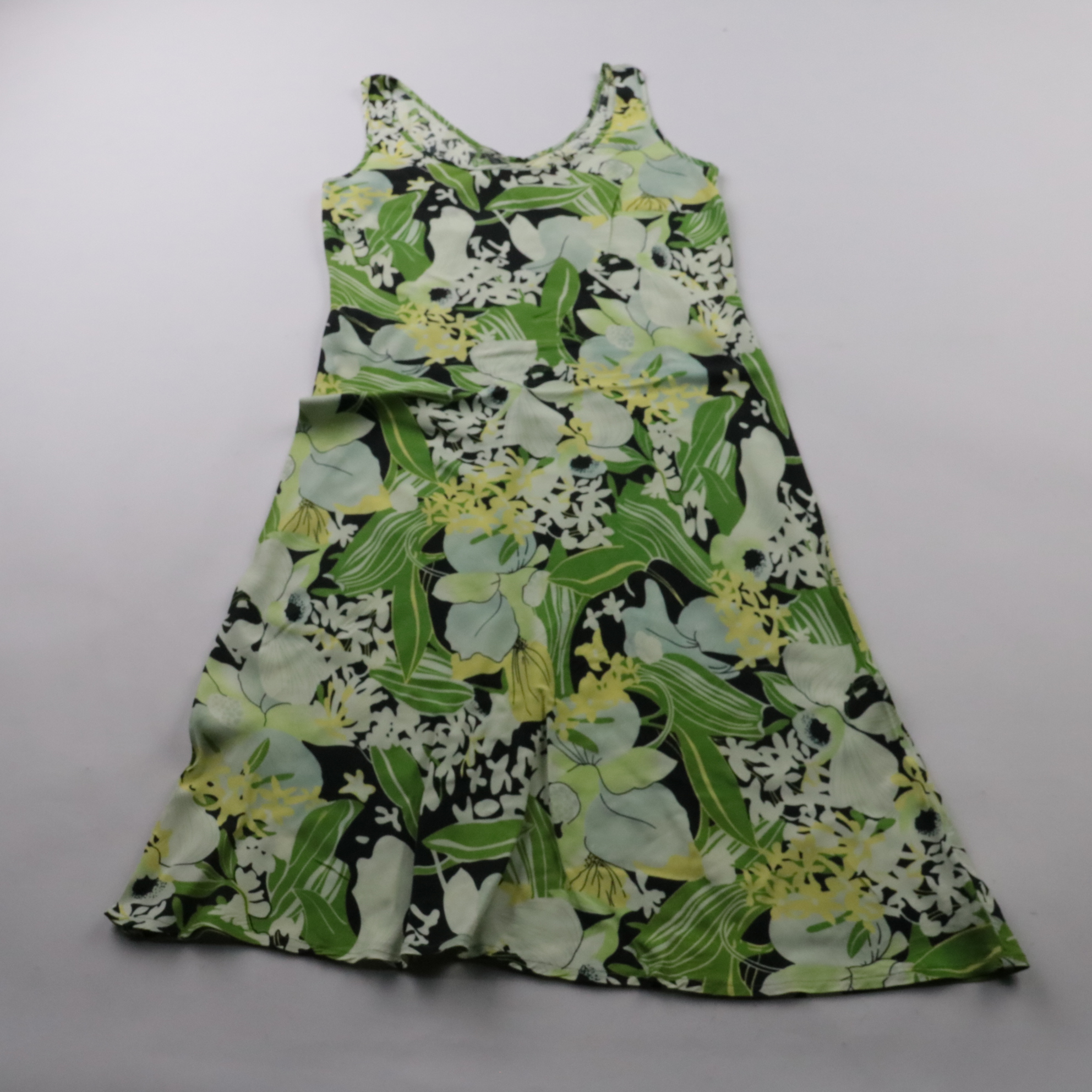 Летнее платье для девочки с ярким цветочным принтом в зелёно-бело-жёлтых тонах. Подойдёт для прогулок и отдыха в тёплую погоду благодаря свободному крою и бретелям. Лёгкая ткань и обработанные швы делают его удобным для повседневной носки.