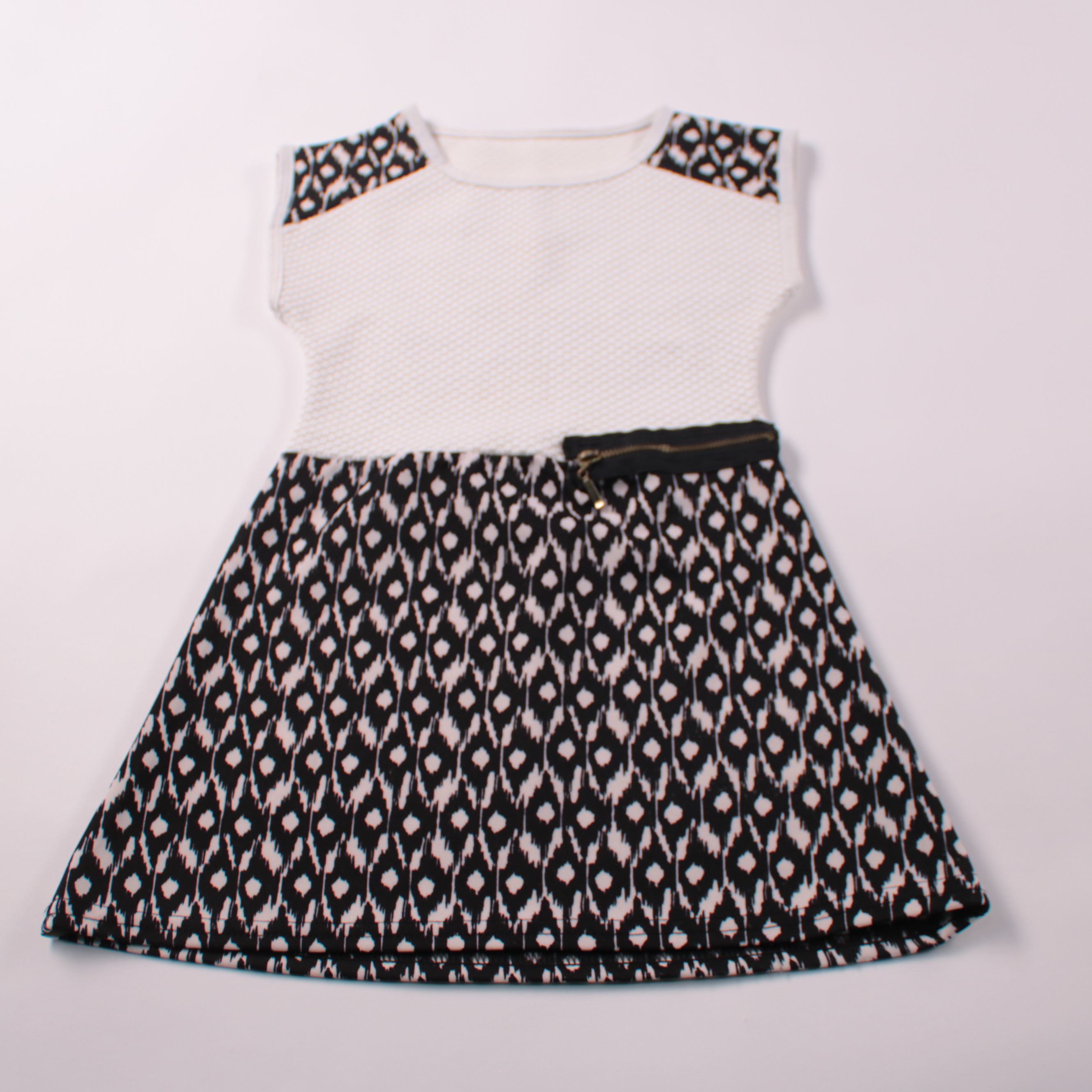 Детское платье без бренда: белый фактурный верх и чёрная юбка с геометрическим принтом, на талии декоративный пояс. Подойдёт для утренников, праздников и семейных мероприятий. Лёгко сочетается с однотонными колготками и кардиганом.