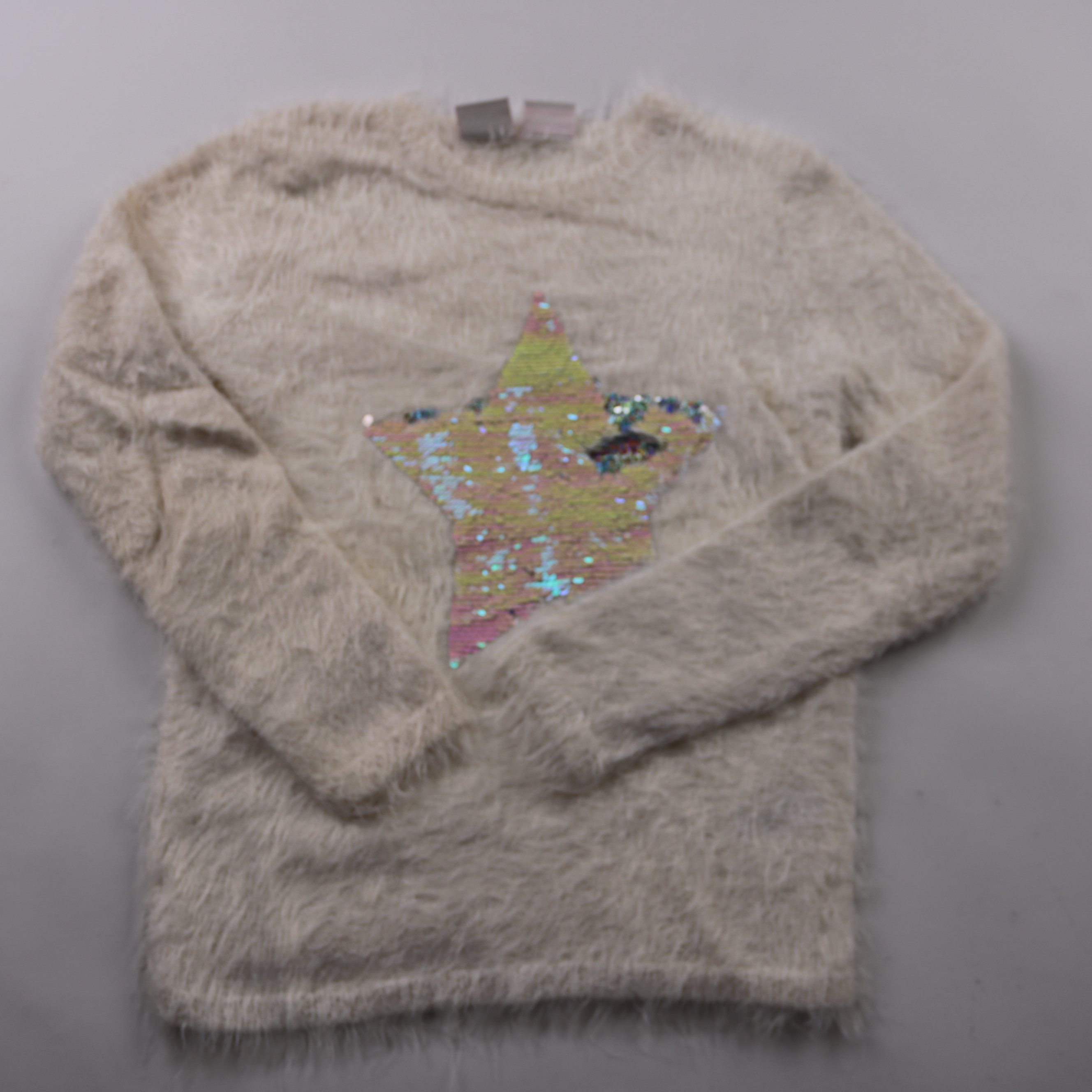 Пушистый свитер Manguun молочного цвета с крупной аппликацией-звездой из пайеток на груди. Подойдёт для школы и прогулок в прохладную погоду, легко сочетается с джинсами и юбками. Мягкая пряжа приятна к телу и хорошо сохраняет тепло.