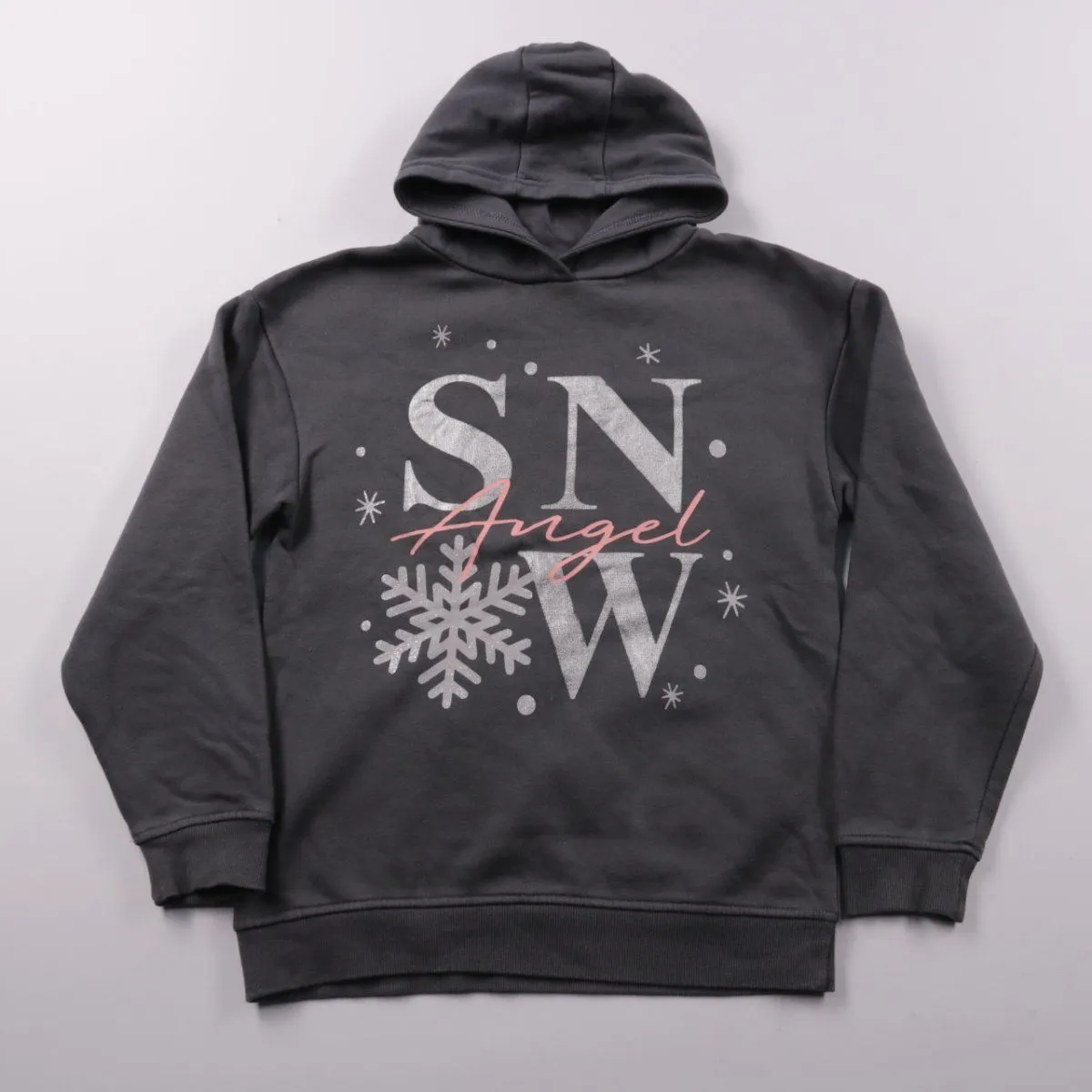Худи Primark тёмно-серого цвета с зимним принтом Snow Angel и капюшоном. Подойдёт для школы и прогулок в прохладную погоду, удобно носить как верхний слой. Мягкая ткань с начёсом внутри сохраняет тепло.