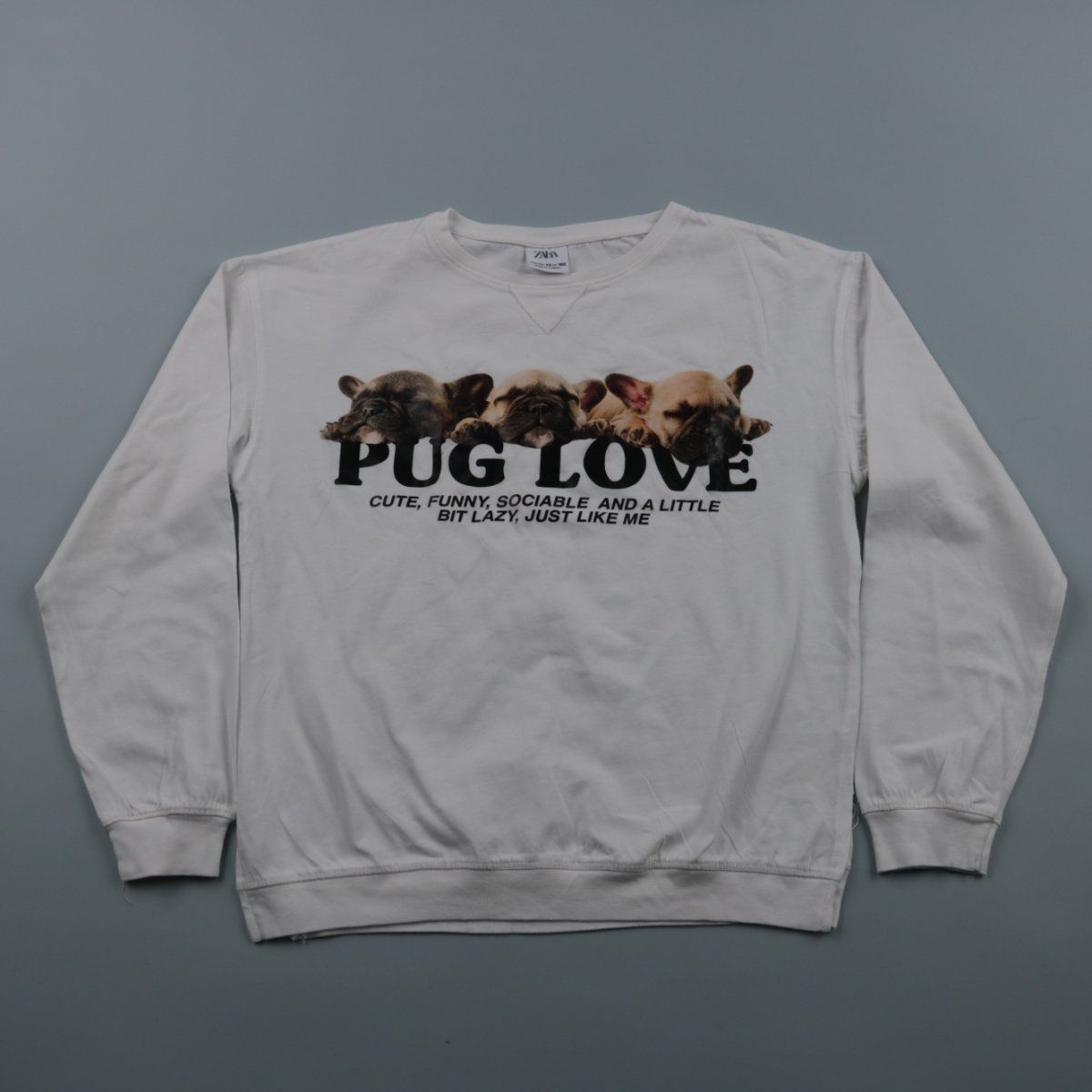 Толстовка Zara белого цвета с принтом «PUG LOVE» и длинным рукавом. Подойдёт для школы и прогулок в прохладную погоду, хорошо сочетается с джинсами и спортивными брюками. Практичный хлопковый трикотаж приятен к телу и прост в уходе.