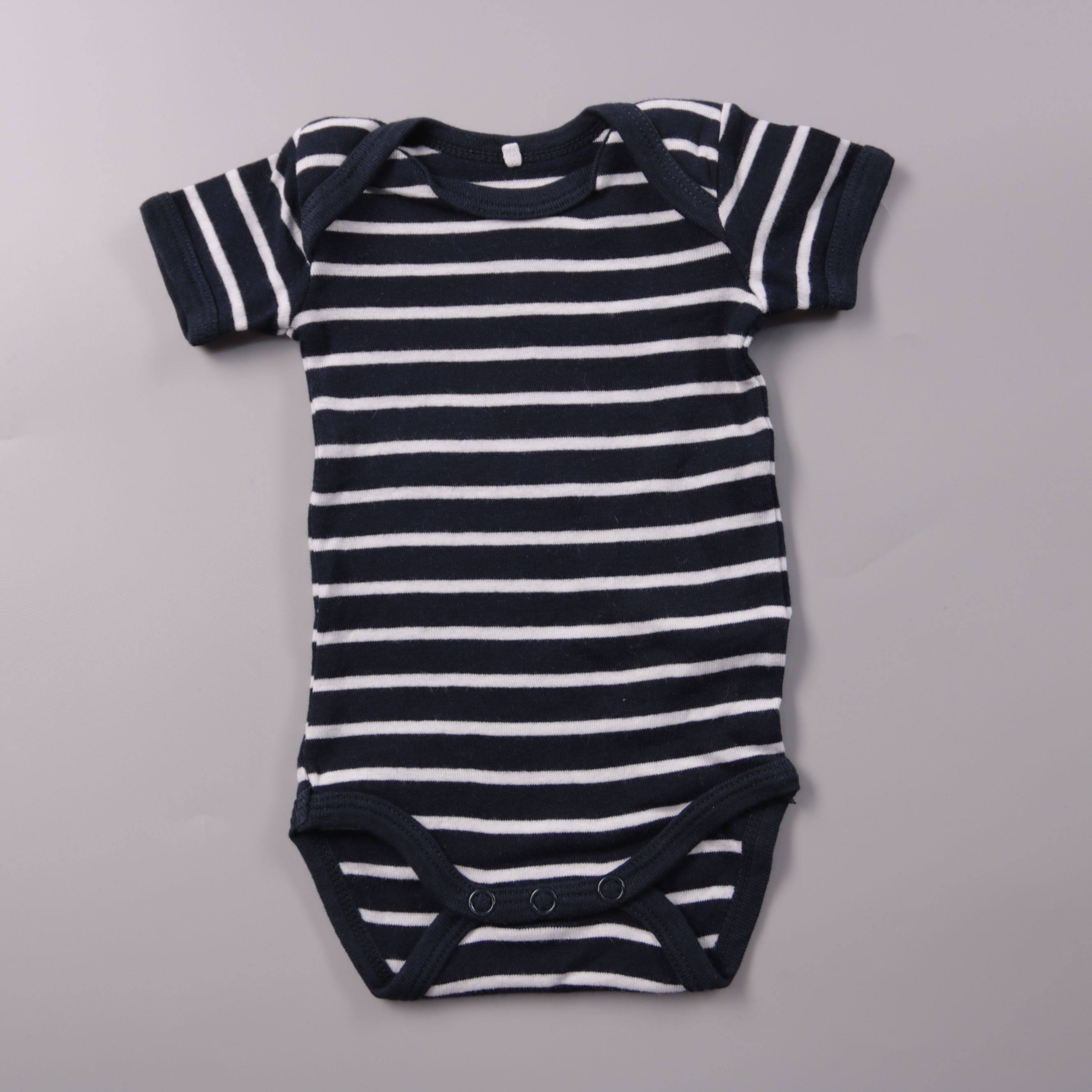 Детское боди с коротким рукавом в сине-белую полоску, бренд не указан. Подойдёт малышу для дома и как первый слой под повседневную одежду. Кнопки снизу упрощают смену подгузника и переодевание.