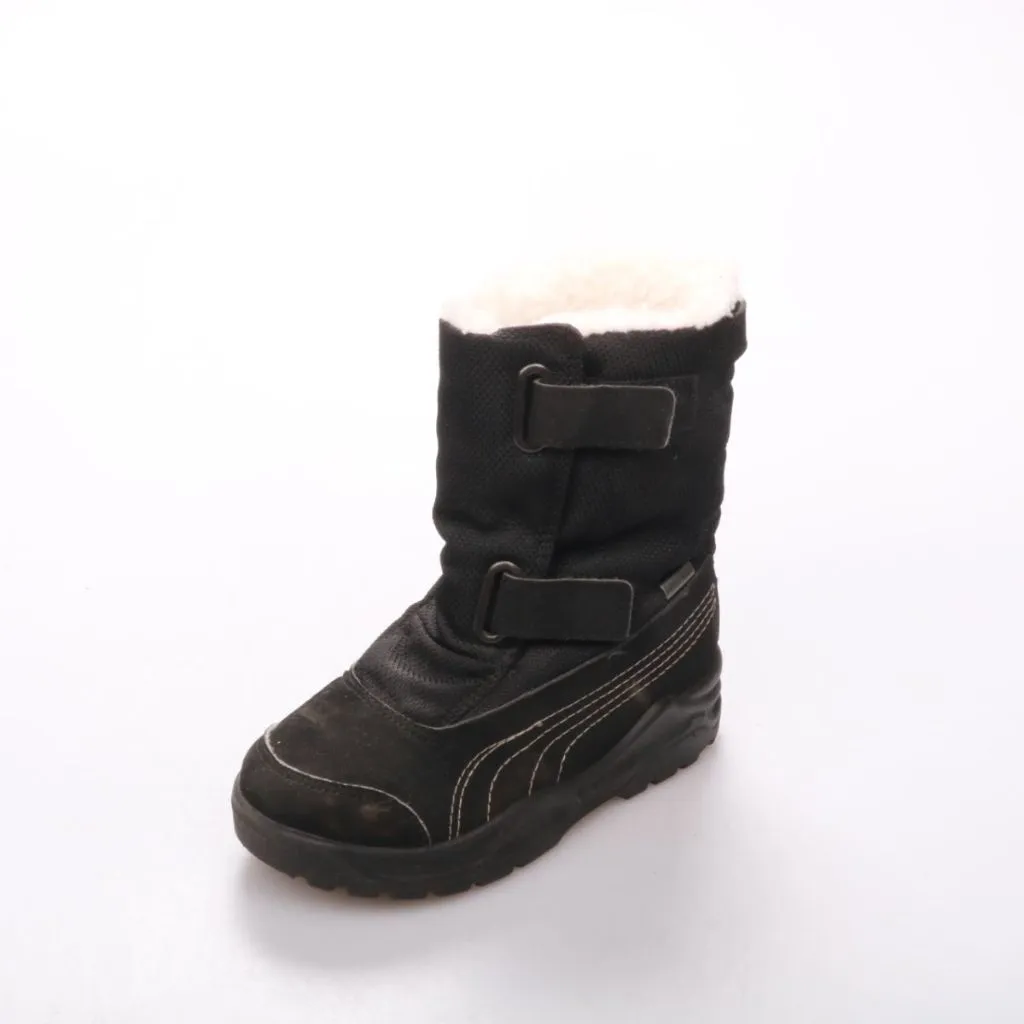 Зимние сноубутсы Puma чёрного цвета с утеплённой меховой подкладкой и застёжками на липучках. Подойдут для прогулок в холодную погоду и активных игр на улице. Рельефная подошва помогает лучше держаться на снегу и мокрой дороге.