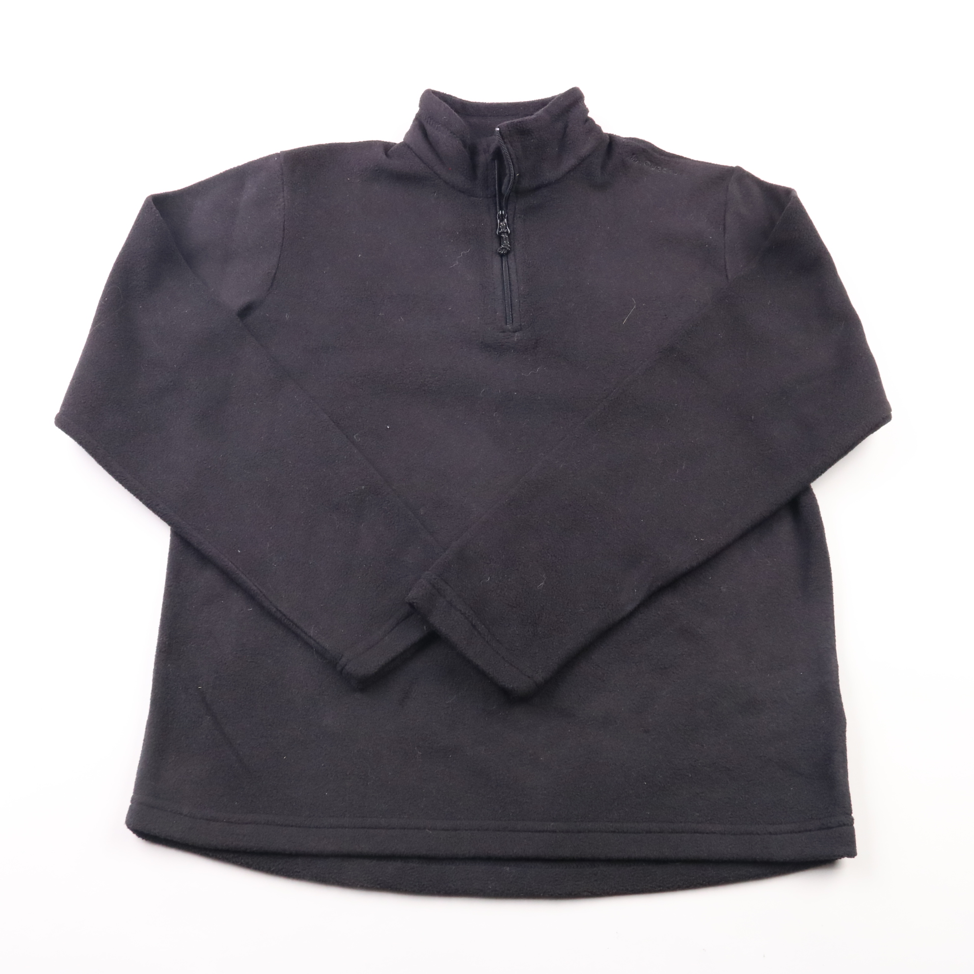 Флисовая толстовка Decathlon чёрного цвета с высоким воротником и короткой молнией. Подойдёт для школы, прогулок и спорта в прохладную погоду, удобно носить как второй слой под куртку. Флис быстро сохнет и прост в уходе.