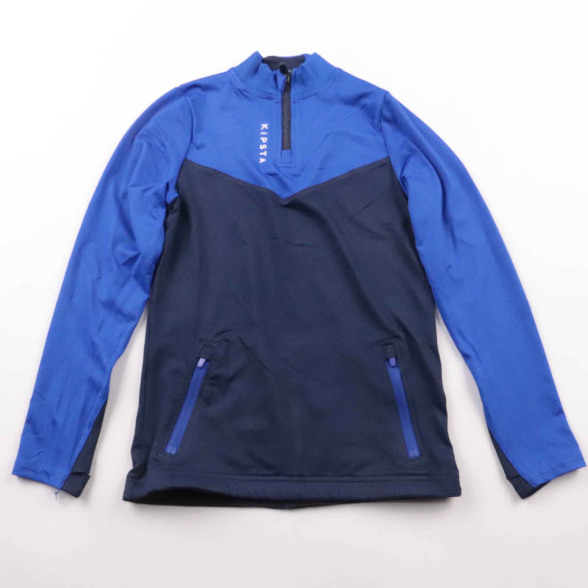 Спортивная толстовка Kipsta на молнии до груди, с высокой стойкой и карманами на молнии, в сине-голубой расцветке. Подойдёт для школы, тренировок и прогулок в прохладную погоду. Практичный материал быстро сохнет и не сковывает движения.