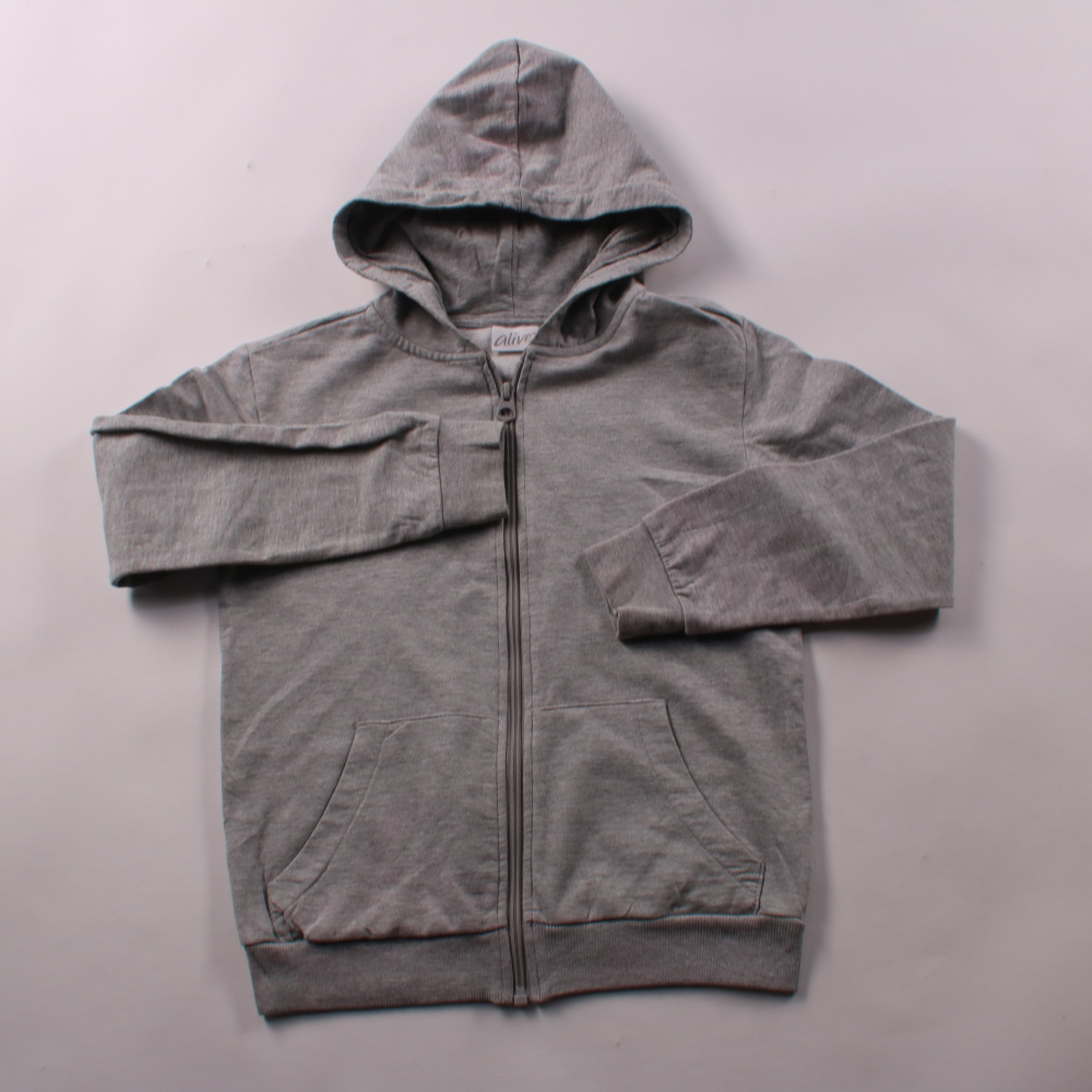 Толстовка на молнии Alive серого цвета с капюшоном и карманами-кенгуру. Подойдёт для школы и прогулок в прохладную погоду, удобно носить как второй слой. Мягкая ткань с высоким содержанием хлопка практична в уходе и комфортна в носке.