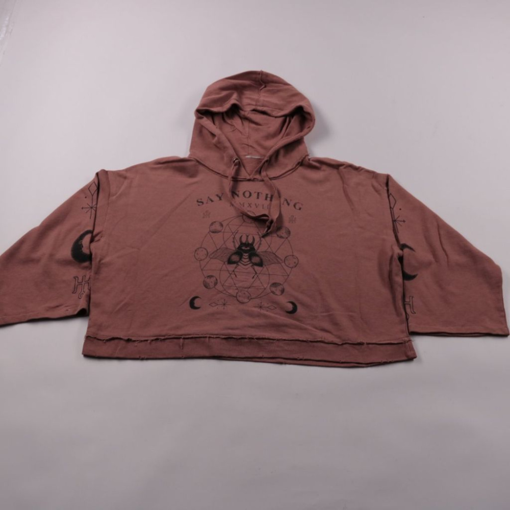 Укороченная толстовка с капюшоном и принтом, без указания бренда. Подойдёт для школы и прогулок в прохладную погоду, можно носить с джинсами или спортивными брюками. Практичный плюс — мягкий футер с начёсом внутри и удобный капюшон.