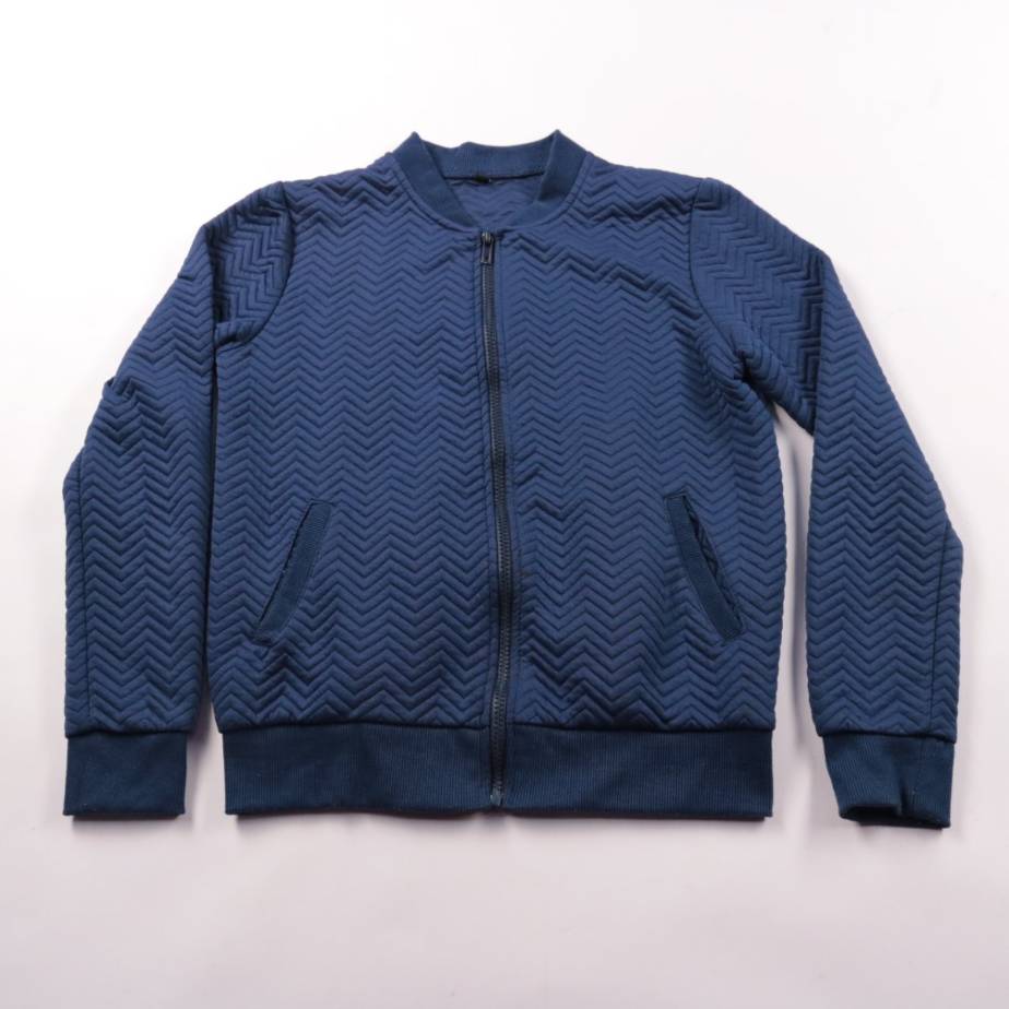 Лёгкая стёганая куртка на молнии в синем цвете, подойдёт для прогулок весной и прохладным летом. Узор «зигзаг» и трикотажные манжеты/низ помогают лучше держать тепло. Есть боковые карманы — удобно для мелочей и рук.