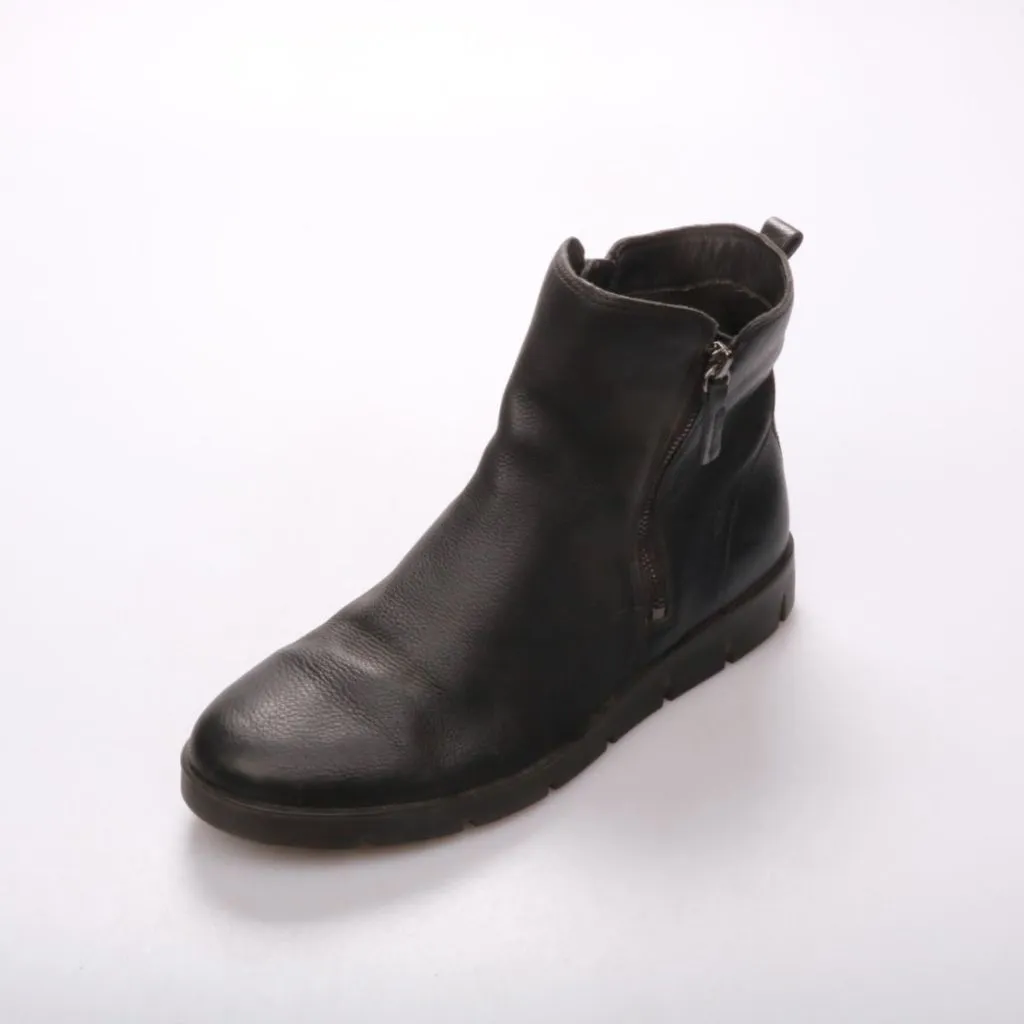 Мужские ботинки Ecco из чёрной натуральной кожи с боковой молнией и петлёй на заднике. Подойдут на каждый день в прохладную погоду, хорошо смотрятся с джинсами и брюками. Подошва из резины с протектором даёт устойчивость на мокром асфальте.