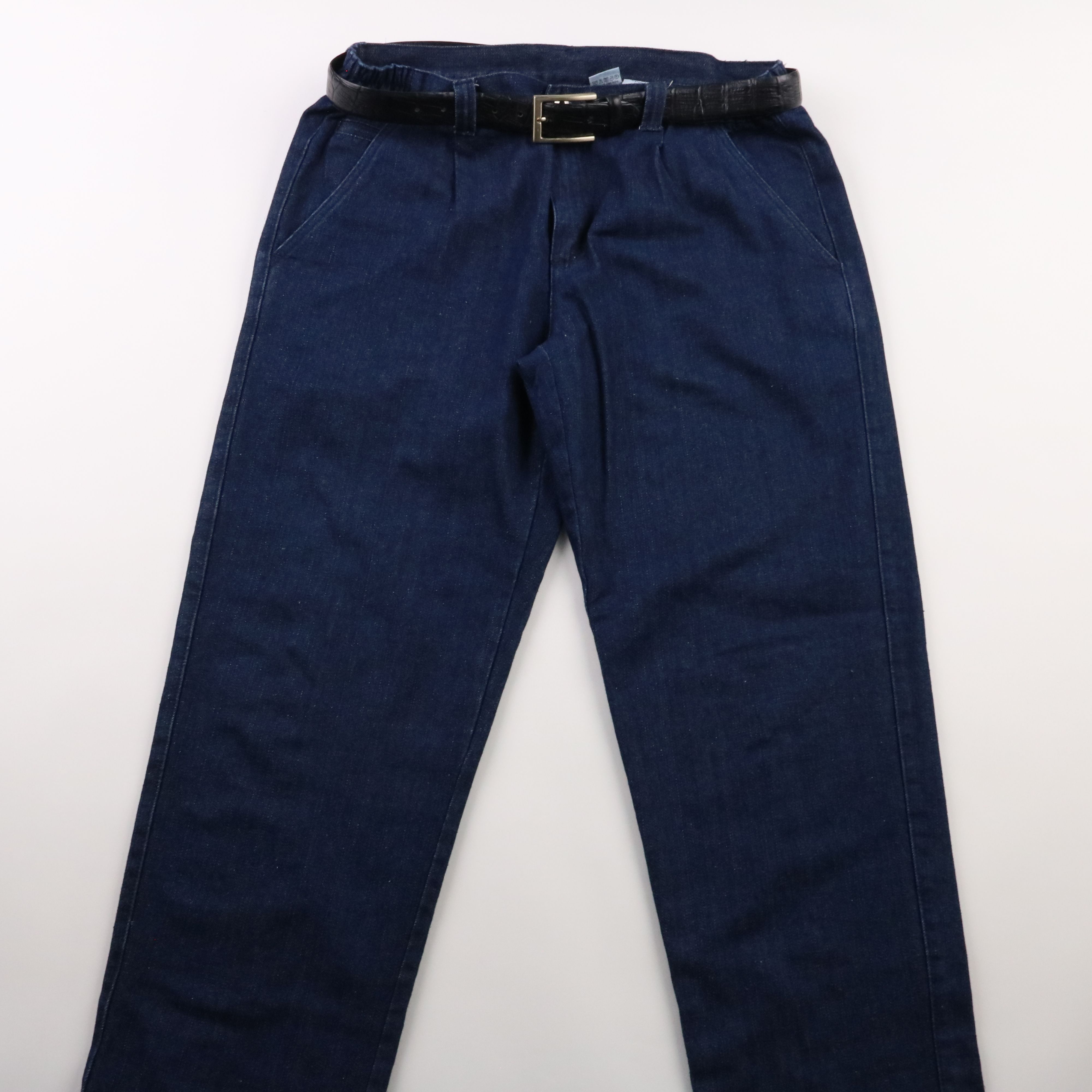 Мужские брюки из тёмно-синего денима, прямого кроя, с классическими карманами и ремнём в комплекте. Подойдут для повседневных образов и более собранного casual с рубашкой или джемпером. Плотная ткань хорошо держит форму и комфортна в носке.
