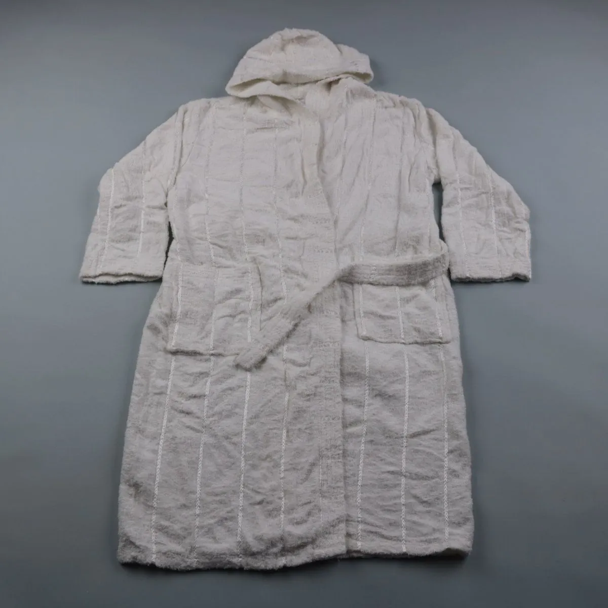 Махровый банный халат с капюшоном и поясом, без указанного бренда. Подойдёт для дома, бани или бассейна после душа благодаря мягкой впитывающей ткани. Есть накладные карманы — удобно держать мелочи под рукой.
