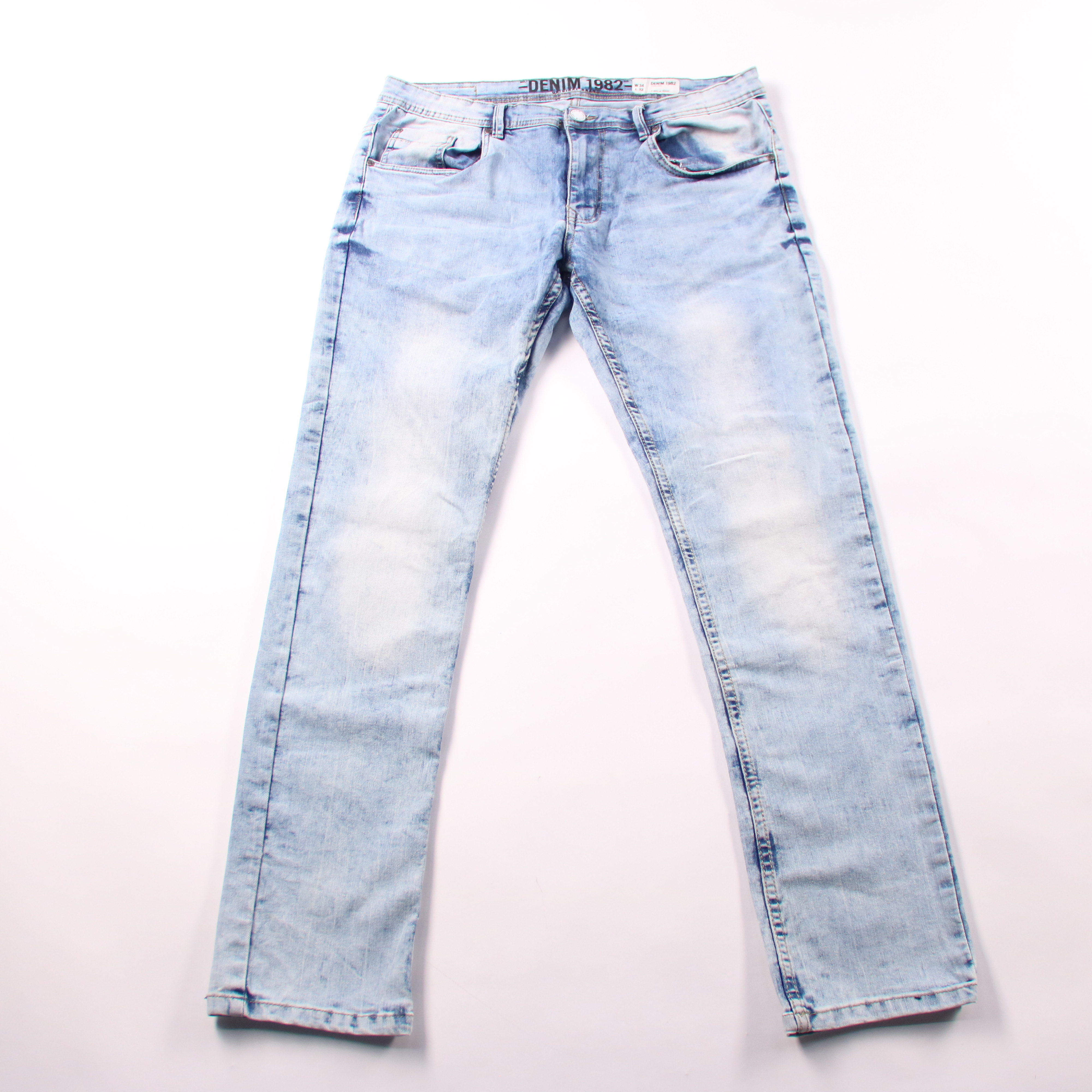 Мужские джинсы Denim 1982 светло-голубого цвета, зауженная модель Slim (W34/L32) с лёгким эффектом потертости. Подойдут для повседневной носки и образов в стиле casual с кедами или ботинками. Практичный деним хорошо держит форму и легко сочетается с ба...