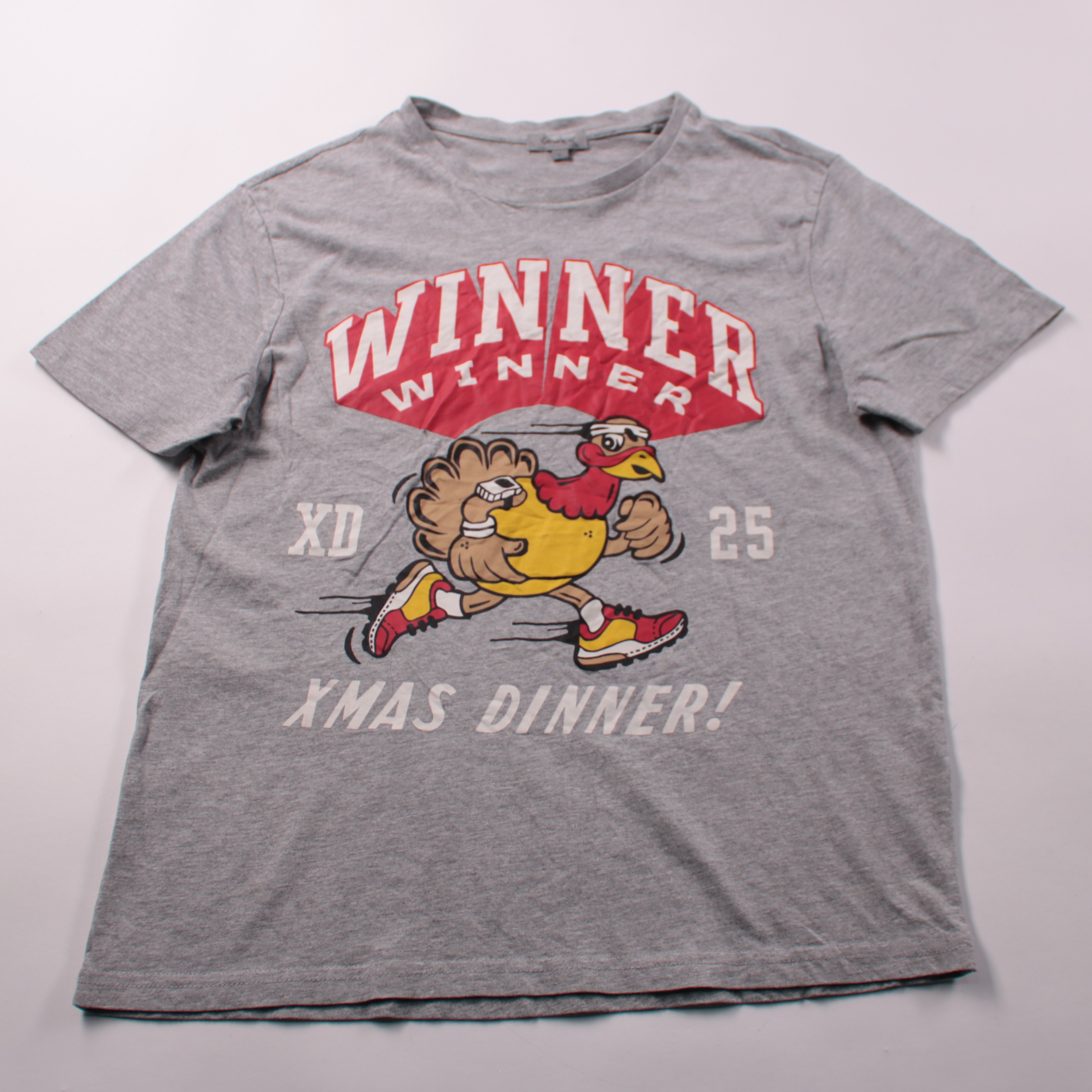 Мужская футболка George серого цвета с крупным принтом «WINNER» и персонажем. Подойдёт для повседневной носки и домашнего отдыха, а также как тематическая вещь на зимние праздники. Ткань хлопковая с добавлением вискозы, мягкая и удобная в уходе.