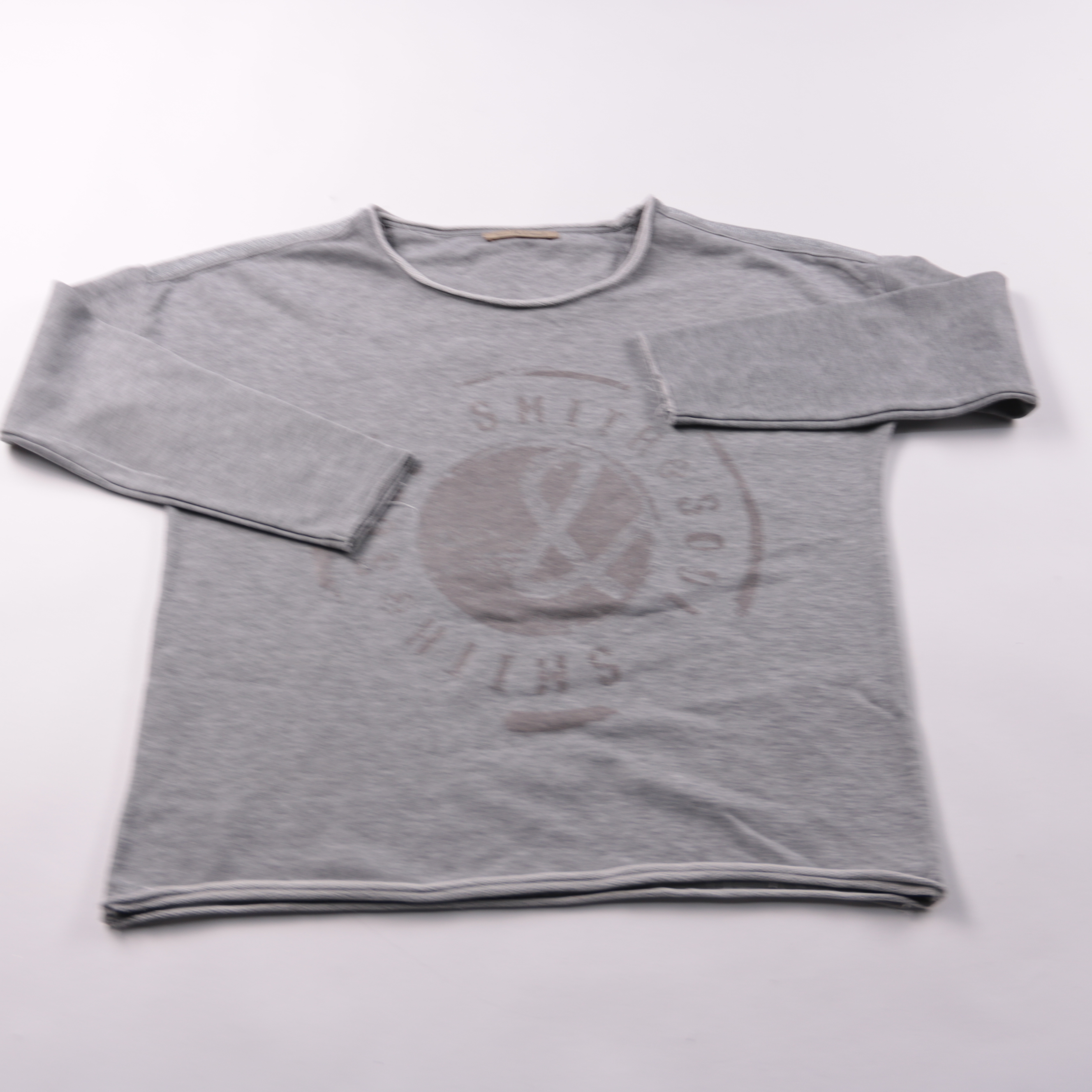 Свитшот Smith&Soul серого цвета с крупным принтом на груди и круглым вырезом. Подойдёт для повседневных образов и дома, хорошо сочетается с джинсами и спортивными брюками. Материал с хлопком в составе приятен к телу и прост в уходе.